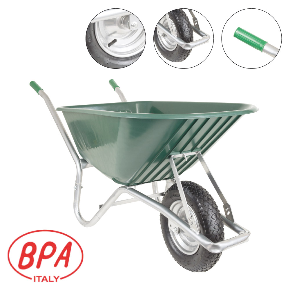 Die Schubkarre, Bauschubkarre KITPL100ZS2 ist eine Markenschubkarre der Firma BPA, die sich besonders durch ihre robuste Bauart und aufgrund ihrer PP-Mulde durch ihre Leichtigkeit auszeichnet