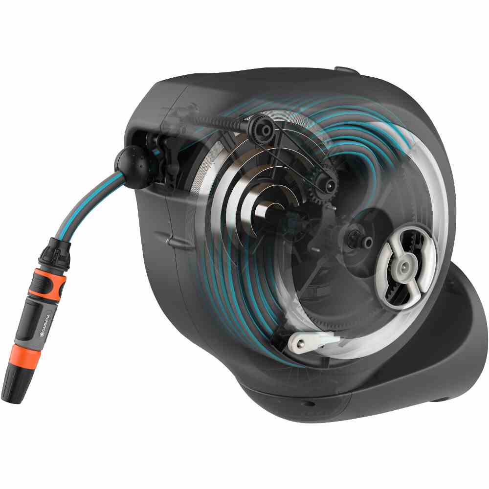 - mit einem leichten Zug am Schlauchende löst Du die Arretierung und eine eingebaute Stahlfeder mit einer innovativen RollControl-Technologie sorgt für einen gleichmäßigen und kontrollierten Rückzug