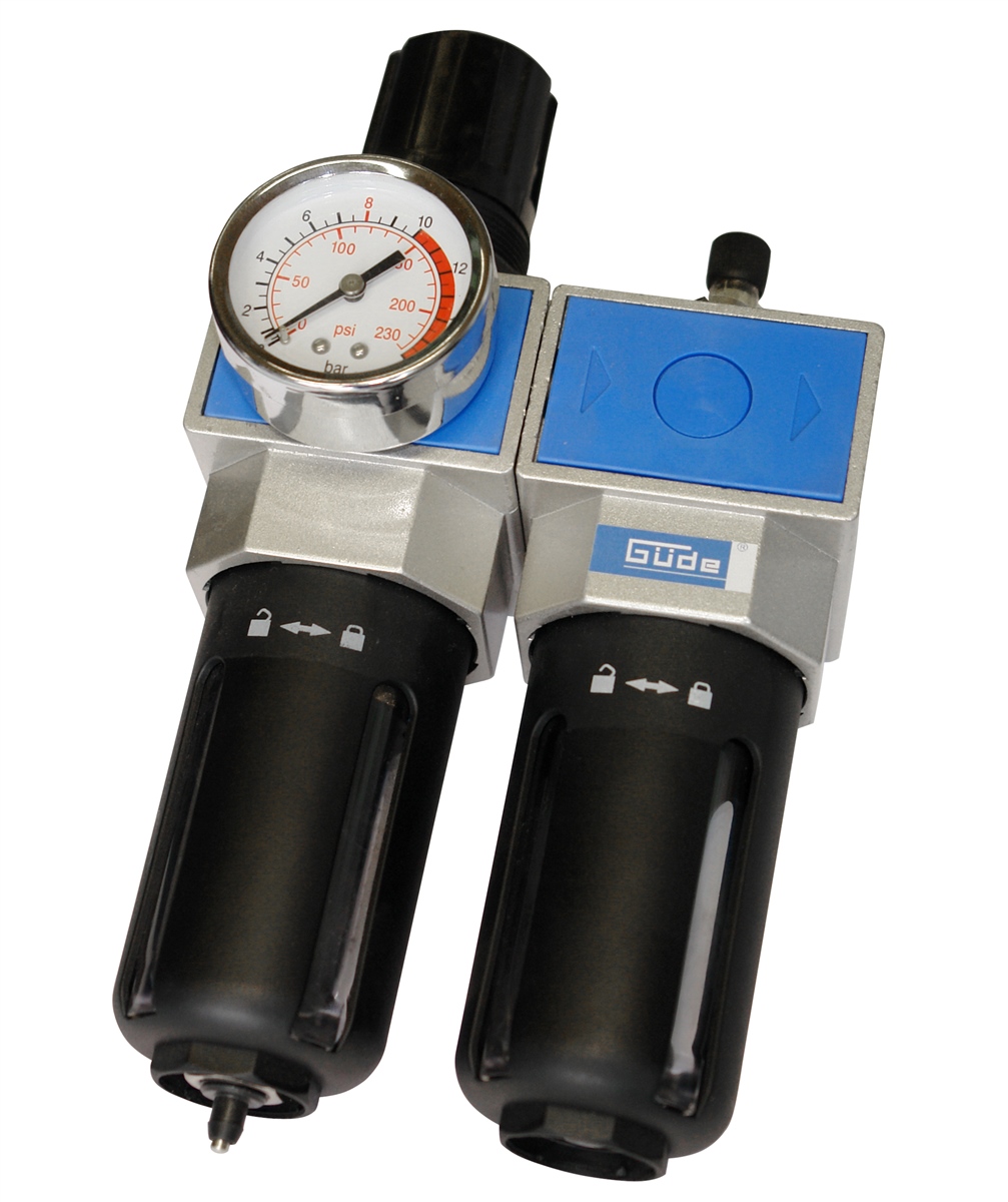 Die Güde-Wartungseinheit ist eine professionelle Ergänzung für Ihre Druckluftanlage. Der Filter-Druckminderer filtert unerwünschtes Kondenswasser zuverlässig aus der Druckluft. Gleichzeitig kann der benötigte Druck bequem am Druckminder eingestellt werden. Der Behälter kann leicht mittels eines Ventils am Becherboden entleert werden. Die Wartungseinheit kombiniert zusätzlich eine Nebelöler, der alle angeschlossenenen Druckluftwerkzeuge automatisch mit Druckluftöl versorgt. Die Ölmenge ist einfach am Ölerkopf einstellbar. Einfach in die bestehende Druckluftleitung zu montieren.