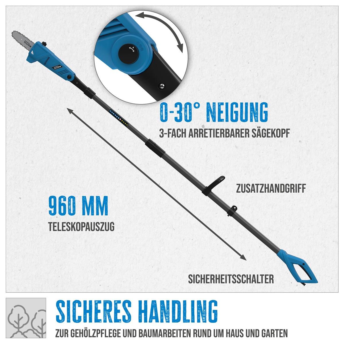 Die Güde Teleskop Astkettensäge GAK 7118.1 ist das ideale Werkzeug, wenn es darum geht, auch in höheren Lagen präzise und komfortabel zu arbeiten. Dank des Teleskopauszugs von 960 mm ermöglicht sie einen mühelosen Zugang zu weit oben gelegenen Ästen. Die automatische Kettenschmierung sorgt dabei für einen stetigen und reibungslosen Betrieb, während die hochwertige Güde-Schneidkette und das Schwert für saubere Schnitte stehen. Der 3-fach arretierbare Sägekopf lässt sich in Winkeln von 0 bis 30° einstellen und passt sich so optimal den Gegebenheiten an. Der praktische Zusatzhandgriff und der mitgelieferte Tragegurt garantieren eine ergonomische Handhabung und erleichtern die Arbeit erheblich. Mit dem Fanghaken können geschnittene Äste leicht entfernt werden. Für zusätzliche Sicherheit sorgt ein spezieller Sicherheitsschalter, der unbeabsichtigtes Einschalten verhindert, sowie eine Kabelzugentlastung, die das Stromkabel vor Belastung schützt. Mit der GAK 7118.1 sind Sie bestens ausgerüstet für alle Baumschnittarbeiten.