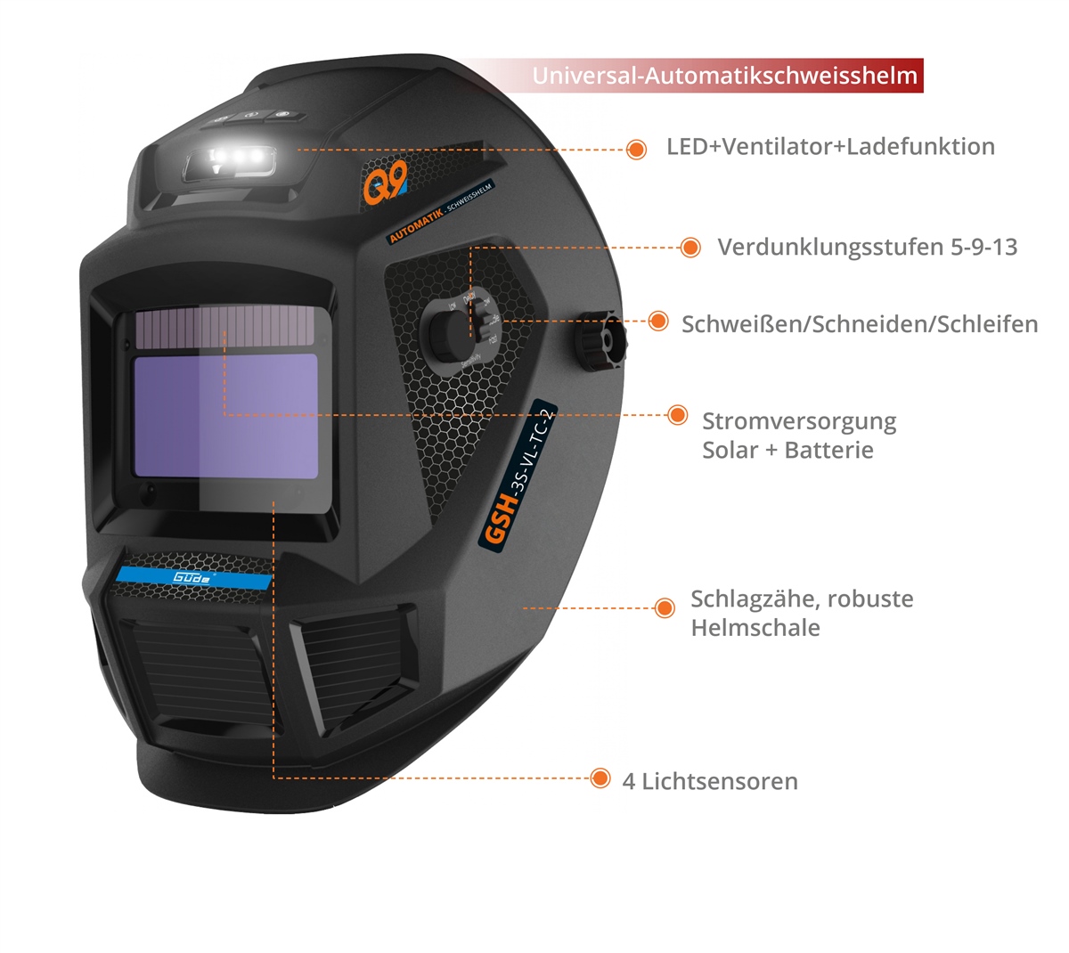 Der Güde-Automatikschweißhelm GSH-3S-VL-TC-2 ist universell einsetzbar für alle gängigen Schweißverfahren, sowie Plasmaschneiden und Schleifarbeiten. Der Automatikschweißfilter sorgt in Verbindung mit der neuen TRUE COLOUR - Technologie für optimalen Schweißkomfort in realen Farben, ganz ohne störende Farbschattierungen. Die 4 Lichtsensoren auf der Filterkasette gewährleisten schnellste Reaktionszeiten und feinste Justierungsmöglichkeiten. Alle Einstellungen sind bequem, (auch mit Handschuhen), von aussen am Helm einstellbar. Der 2-stufig, integrierte LED-Arbeitsscheinwerfer sorgt für beste Lichtverhältnisse, auch an schlecht beleuchteten Stellen und in dunkleren Räumlichkeiten. Unser Universalhelm zeichnet sich zusätzlich durch einen im Kopfteil eingebauten, 2-stufigen Ventilator aus, der dauerhaft für eine angenehme Arbeitstemperatur im Helm sorgt, verbrauchte Atemluft absaugt und einen Beschlag der Filterscheibe verhindert. Das stufenlos verstellbare Kopfband mit integriertem Stirn- und Hinterkopfpolster bietet größtmöglichen Tragekomfort und passt sich optimal an jede Kopfform und -größe an. Selbstverständlich sind unsere Schweißhelme von der dafür zuständigen Prüfstelle Dincertko geprüft und zertifiziert.
