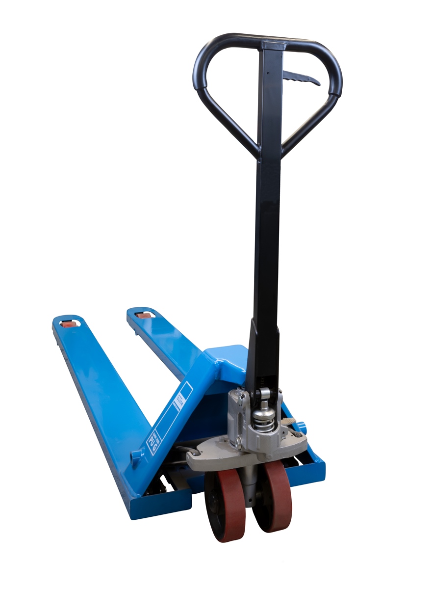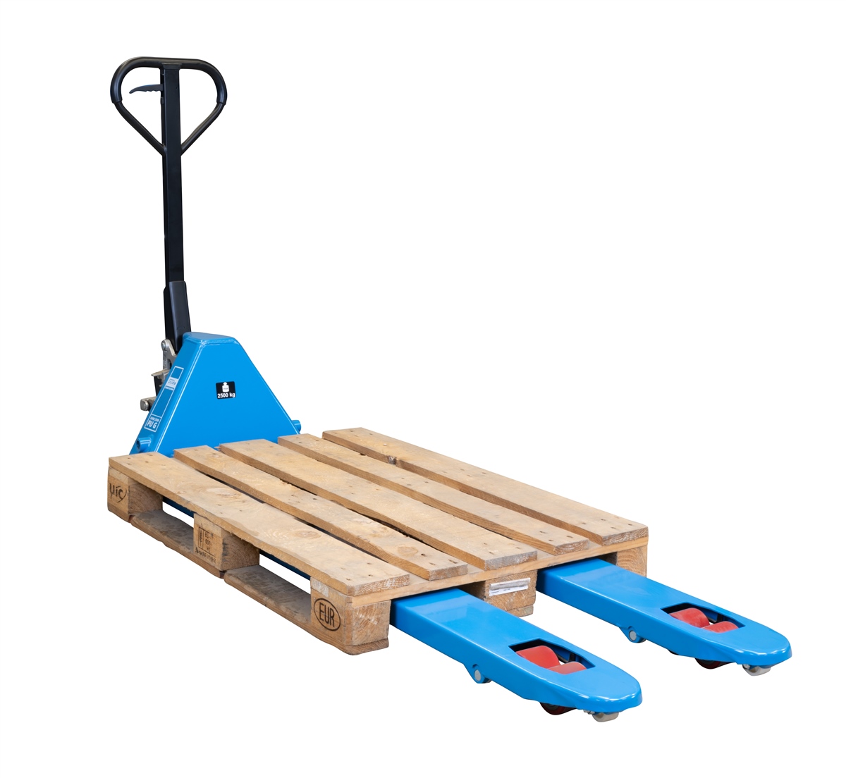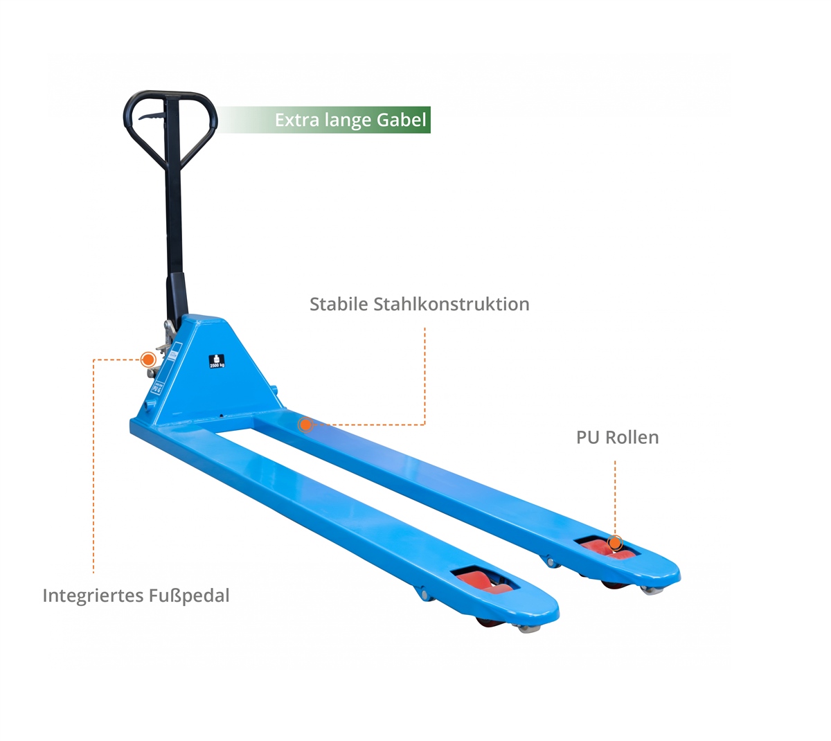 Der Gabelhubwagen GHW 2500-180 PU ist ein treuer Helfer bei Transportarbeiten in Ihrem Lager oder Ihrer Werkstatt. Sein stabiler Aufbau mit der verwindungssteifen Stahlkonstruktion und der um 180°- drehbaren Lenksäule sorgt für einen verlässlichen Transport von A nach B. Durch seine besonders lange Gabel ist er ideal geeignet zur Bewegung überlanger Paletten mit bis zu 1,80 Meter Länge. Die Traglast beträgt 2.500 kg. Die Hebefunktion wird über die Deichsel mit Ventilsteuerung ausgeführt. Die Senkfunktion kann am Griff und zusätzlich an einem integrierten Fußpedal ausgelöst werden. Die Polyurethan-Rollen sorgen für ein leises Laufgeräusch auf harten Böden.
