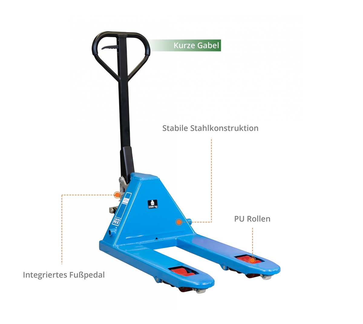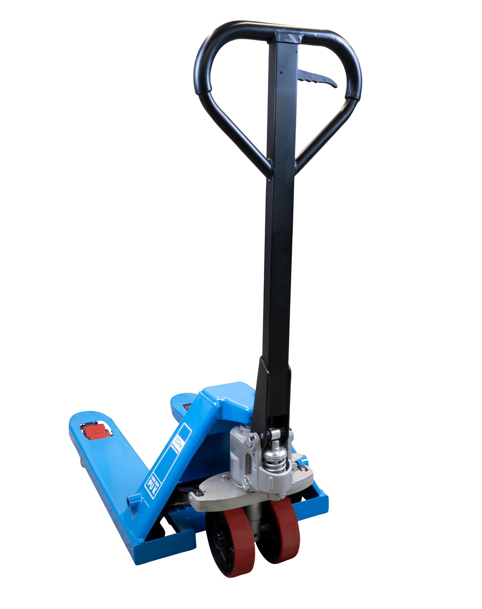 Der Gabelhubwagen GHW 2500-80 PU ist ein treuer Helfer bei Transportarbeiten in Ihrem Lager oder Ihrer Werkstatt. Sein stabiler Aufbau mit der verwindungssteifen Stahlkonstruktion und der um 180°- drehbaren Lenksäule sorgt für einen kleinen Wendekreis. Durch seine kurze Gabel eignet er sich perfekt für den seitlichen Paletteneinstich und den Transport kleinerer Einwegpaletten. Seine Traglast beträgt 2.500 kg. Die Hebefunktion wird über die Deichsel mit Ventilsteuerung ausgeführt. Die Senkfunktion kann am Griff und zusätzlich an einem integrierten Fußpedal ausgelöst werden. Die Polyurethan-Rollen sorgen für ein leises Laufgeräusch auf harten Böden.