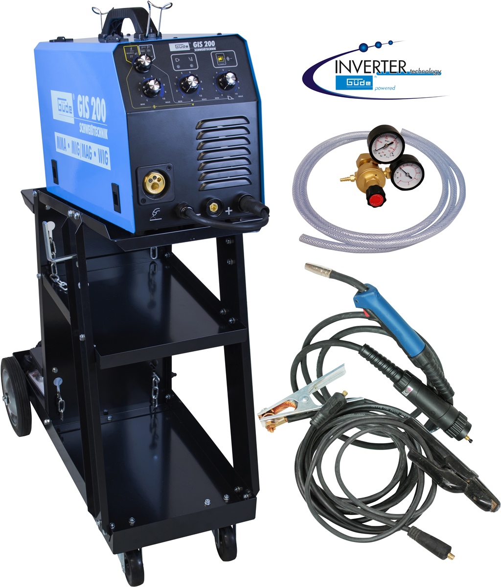Das GIS 200 ist DAS Universalgerät der Inverterschweißmaschinen in der Güde Flotte. Mit dem 200A Gerät sind praktisch alle 4 Schweißverfahren möglich, MIG-MAG, MMA ( Elektrodenschweißen ), Flux ( Fülldrahtschweißen ) und schließlich WIG-Schweißen, mit dem optional erhältlichen WIG-Brenner #41690. Bestens geeignet für gelegentliche, kurze Einsätze bei kleineren bis mittleren Schweißarbeiten im Heimwerker und semiprofessioinellen Bereich. Die bewährten Zusatzeigenschaften wie ARC-Force, Anti-Stick und Hot-Start, sorgen für besten Schweißkomfort, auch bei schwierigen Anforderungen. Weitere Einstellmöglichkeiten wie 2-Takt bzw 4-Takt-Schweißen ( Dauerdrahtvorschub ) sowie die manuelle Vorschubtaste zum Einführen des Schweißdrahtes, runden die professionelle Ausstattung ab. Elektrodenhalter und Masseklemme, sowie der Bürstenhammer, für MMA-Prozesse sind selbsterverständlich serienmäßig im Lieferumfang enthalten. Gleiches gilt natürlich für den MIG-MAG-Brenner und den Druckregler für das Schutzgas. Der ebenfalls im Lieferumfang enthaltene Schweißwagen sorgt für Ordnung und optimale Mobilität.