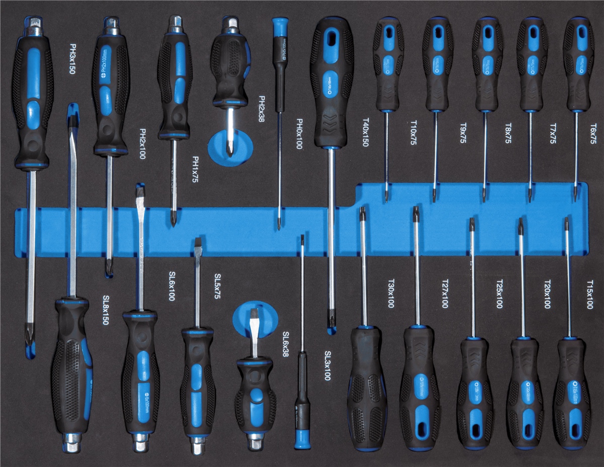 - 21 Softgriff-Schraubendreher, magnetisch: PHO/PH2*100,PH2*38,PH1*75,PH3*150,SL3 /SL6*100,SL6*38, SL5*75,SL8*150,T6/T7/T8/T9/T10*75,T15/T20/T25/T27/T30*100,T40*150