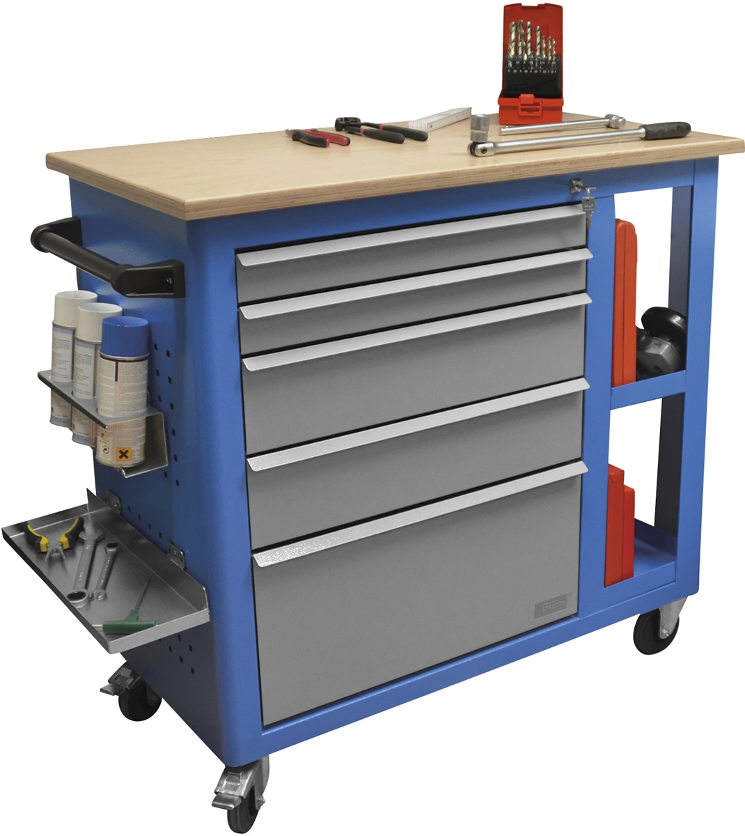 Die Güde GWB 05 ist die ideale Kombination aus stationärer Werkbank und mobilen Werkstattwagen. Und dies in professioneller Ganzstahlkonstruktion, hochwertiger Pulverbeschichtung, mehrschichtverleimte Arbeitsplatte, 5 Schubladen mit kugelgelagerten Vollauszugschienen und einer Zentralverriegelung mit Zylinderschloss inkl. 2 Schlüsseln.