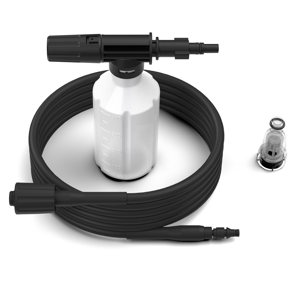 - praktische Halterungen rund um den Hochdruckreiniger für Zubehör und Anschlusskabel