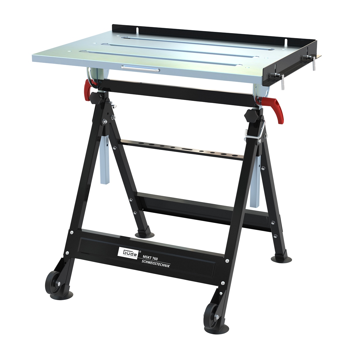 Der mobile Schweißklapptisch MSKT 760 von Güde ist ein vielseitig nutzbarer Universaltisch, der in keiner Heim- und Handwerker-Werkstatt fehlen darf. Er kann mobil, sowohl als Schweißtisch aber auch als Werkbank oder Maschinenuntergestell genutzt werden. Ein idealer Begleiter auf Montage, zusammenklappbar und einfach zu transportieren, durch zwei hochwertige Transportrollen und einem komfortablen Handgriff. Der Tisch lässt sich einfach und schnell auf 4 verschiedene Arbeitshöhen, (780-830-880 und 930 mm) einstellen und ist zusätzlich, beidseitig jeweils 90° schwenkbar. Eine Werkzeugleiste zur Aufbewahrung von Schraubendrehern und anderen Werkzeugen, rundet diesen innovativen und vollendet durchdachten Werkstatttisch schließlich ab. Nach getaner Arbeit lässt sich der Tisch zur Aufbewahrung, platzsparend zusammenklappen.