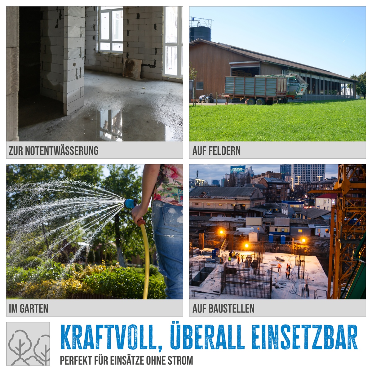 Zum Pumpen von sauberem bis leicht verschmutztem Wasser. Ideale Lösung für Einsätze ohne Stromnetz - z.B. zur Notentwässerung, zum Einsatz auf Feldern, Baustellen oder zur Gartenbewässerung.