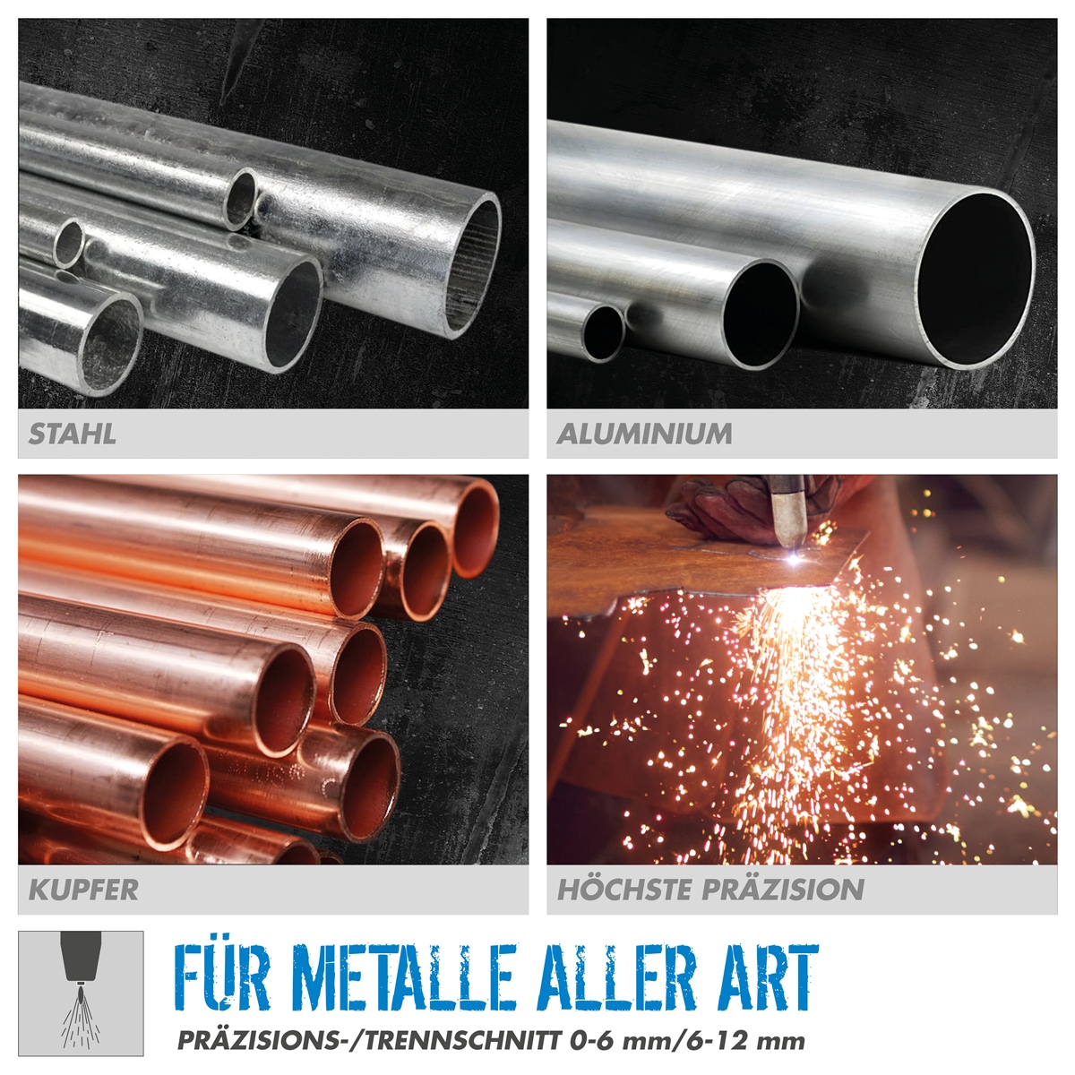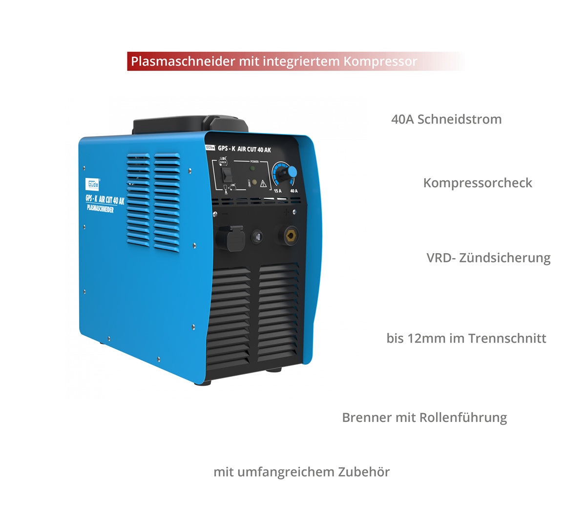 Der Güde Plasmaschneider GPS-K AirCut 40 AK vereint Plasmaschneider und Kompressor in Einem und kann somit sowohl stationär in der Werkstatt, also auch mobil auf Montage eingesetzt werden. Mit einem max. Schneidstrom von bis zu 40A ist der GPS-K AirCut 40Ak in der Lage alle metallischen Materialien bis zu einer Stärke von 12mm im Trennschnitt und bis zu 6mm im Präzisionsschnitt zu schneiden. Modernste Invertertechnologie und Bauteile wie IGBTs ermöglichen eine kompakte Bauweise, sowie eine Arbeitsfrequenz von bis zu 40 000HZ und eine deutliche höhere Einschaltdauer als bei herkömmlichen Tranformator-Geräten. Die im Lieferumfang enthaltene Brenner-Rollenführung und das 2,5mtr lange Brennerkabel sorgen für größtmögliche Flexibilität sowie eine präzise und saubere Schnittführung. Mit einer eingbauten Zündsicherung; HRD ( Hazard-Reduktion-Device ) und der innovativen Auslöse-Sicherung am Brenner, ist der Anwender schließlich optimal geschützt.
