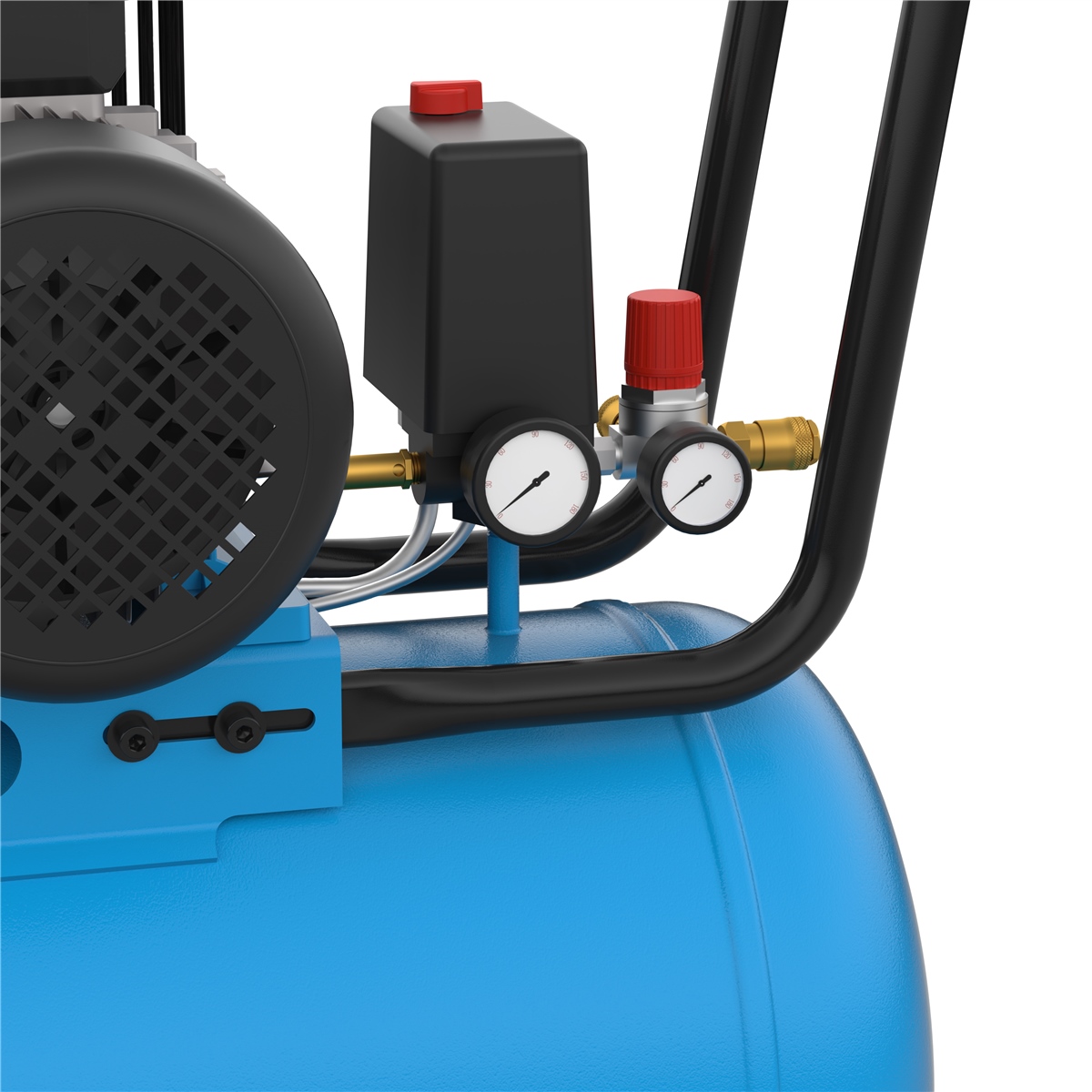 Ein ölgeschmiertes Druckluftkompressor 580/10/100 H: 2-Zylinder-Aggregat mit Riemenantrieb bildet das Herzstück. Der Druckschalter ermöglicht die präzise Steuerung, unterstützt vom Druckminderer für einfaches Arbeitsdruck-Setup. Mit Kesseldruck- und Arbeitsdruckmanometern behält man stets den Überblick. Zwei Druckluftkupplungen gewährleisten flexible Anschlüsse. Sicherheitsventil und Kondensatablassschraube sorgen für Sicherheit und Sauberkeit. Ein Rückschlagventil hält den Druck stabil. Der Transportgriff erleichtert den Transport. Ein integrierter Luftfilter sorgt für saubere Luft. Überlastungsschutz und Nachkühler garantieren langlebigen Betrieb. Auf stabilen Kunststoffrädern mit zwei Lenkrollen ist das Gerät leicht zu bewegen.