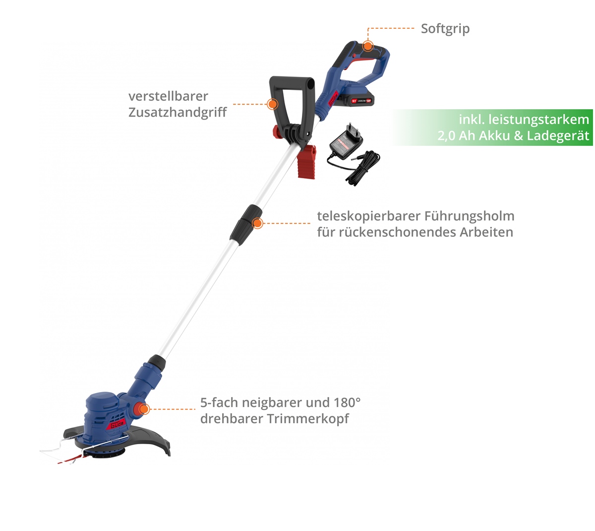 - 180° drehbarer Trimmerkopf zum Schneiden von Rasenkanten