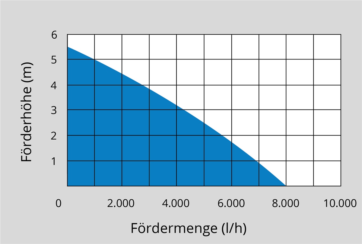 Motorleistung: 400 WattSpannung: 230 Volt / 50 HzSchutzart: IP X8Fördervolumen: 8000 l/hMaximale Förderhöhe: 5,5 MeterMaximale Ansaughöhe: 4 MeterMaximale Wassertemperatur: 35 °CAnschlussgewinde: 1 1/4" InnengewindeLänge des Anschlusskabels: 10 MeterMaßeHöhe: 275 mmBreite: 130 mmLänge: 200 mmGewicht: 3,2 kg