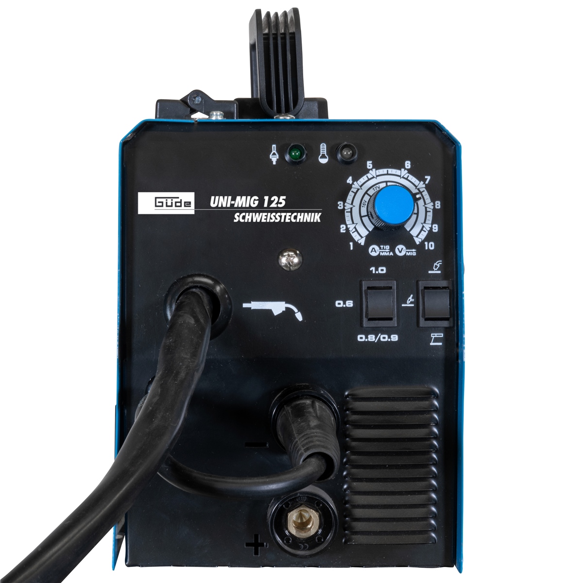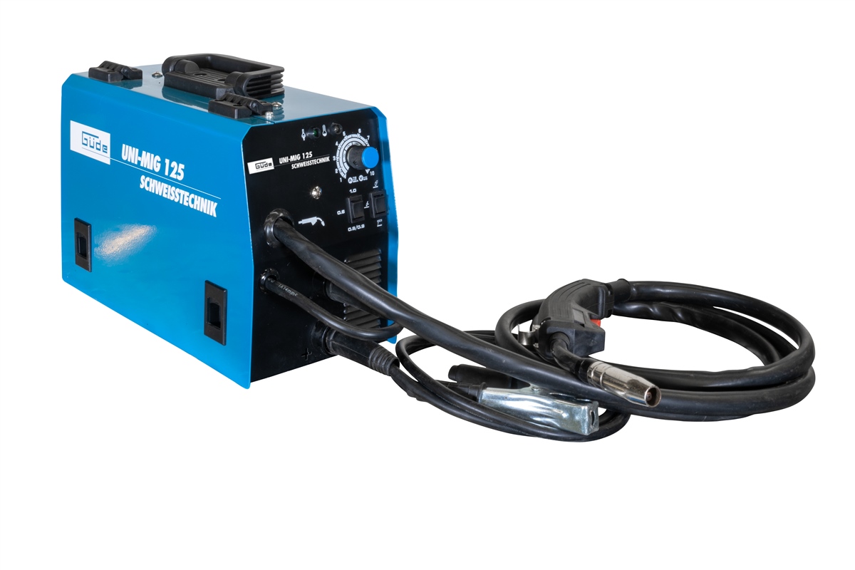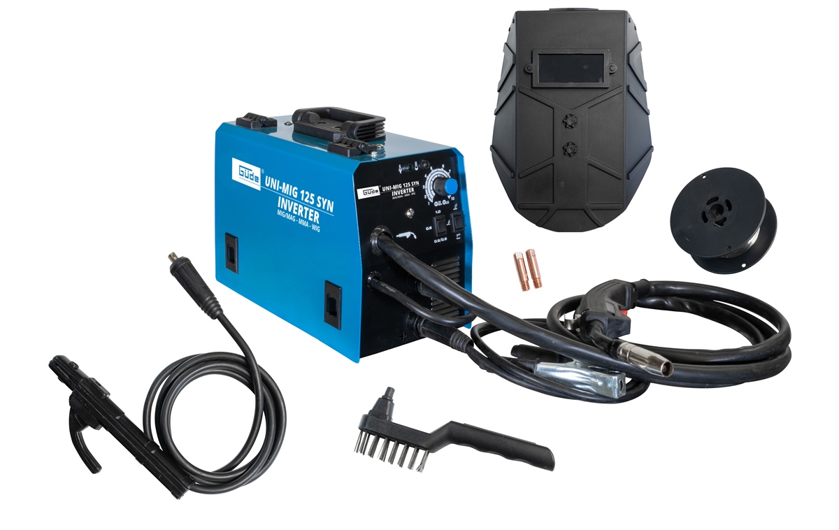 Das Uni-Mig 125 SYN, ist das kleine Multitalent der Inverterschweißmaschinen in der Güde Flotte. Mit dem 120A Gerät sind praktisch alle 4 Schweißverfahren möglich, MIG-MAG, MMA ( Elektrodenschweißen ), Flux ( Fülldrahtschweißen ) und schließlich WIG-Schweißen, mit dem optional erhältlichen WIG-Brenner # 41690. Bestens geeignet für gelegentliche, kurze Einsätze bei kleineren bis mittleren Schweißarbeiten im Heimwerker und Hobbybereich. Die bewährte Zusatzeigenschaft Anti-Stick, sorgt für angenehmen Schweißkomfort, auch bei schwierigen Anforderungen. Elektrodenhalter und Masseklemme, sowie der Bürstenhammer, für MMA-Prozesse sind selbsterverständlich serienmäßig im Lieferumfang enthalten. Gleiches gilt natürlich für den MIG-MAG-Brenner. Der neue, innovative, synergic-geregelte Drahtvorschub stellt sich, nach Auswahl von Schweißverfahren, Drahtstärke und Schweißstärke, automatisch auf die passende Geschwindigkeit ein. Das ebenfalls im Lieferumfang enthaltene Schweißschild sorgt für den notwendigen Schutz beim Schweißen.
