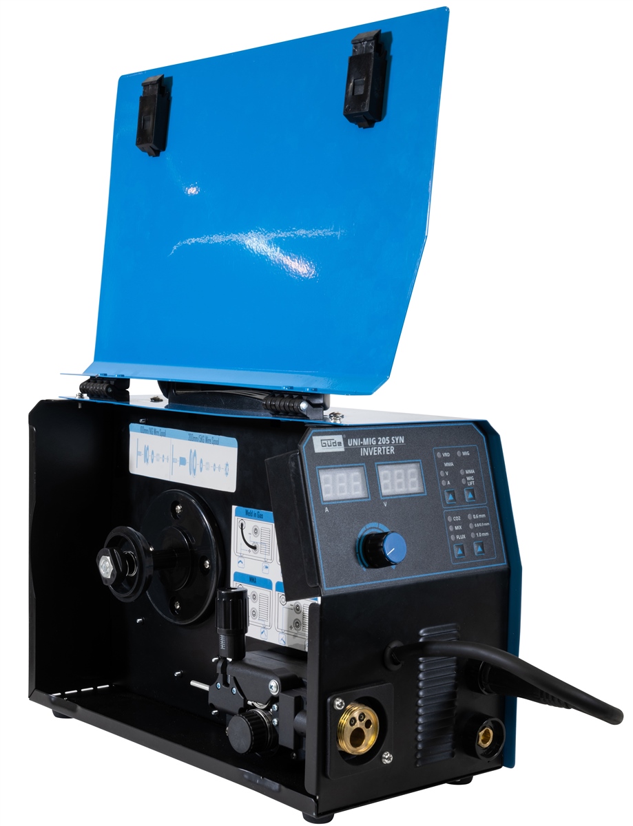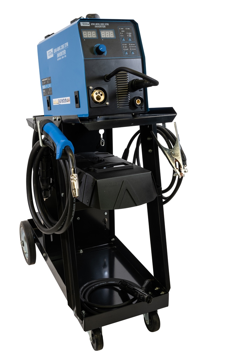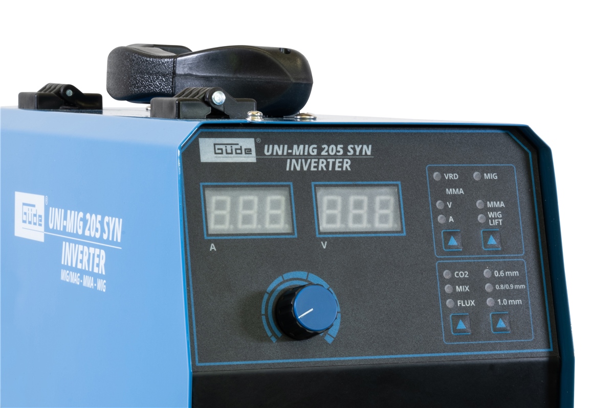 Das Uni-Mig 205 SYN gehört zu den Universalgeräten der Inverterschweissgeräte in der Güde-Produktlinie. Mit dem Uni-Mig 205 SYN sind praktisch alle 4 Schweißverfahren möglich, MIG-MAG, MMA (Elektrodenschweißen), Flux (Fülldrahtschweißen) und schließlich WIG-Schweißen (optional). Die bewährten Zusatzeigenschaften wie Anti-Stick, Hot Start und Arc Force, sorgen für höchsten Schweißkomfort, auch unter schwierigen Bedingungen. Der neue, innovative, synergic-geregelte Drahtvorschub stellt sich, nach Auswahl von Schweißverfahren, Drahtstärke und Schweißstärke, automatisch auf die passende Geschwindigkeit ein. Vor allem auch Einsteigern und noch ungeübten Schweißern ermöglichen diese Zusatzfunktionen, sofort gute Schweißergebnisse. Elektrodenhalter und Masseklemme, sowie das Schweißschild und der Bürstenhammer, für MMA-Prozesse sind selbstverständlich serienmäßig im Lieferumfang enthalten. Gleiches gilt natürlich für den MIG-MAG-Brenner und den Druckregler für das Schutzgas. Der ebenfalls im Lieferumfang enthaltene Schweißwagen sorgt für Ordnung und optimale Mobilität.