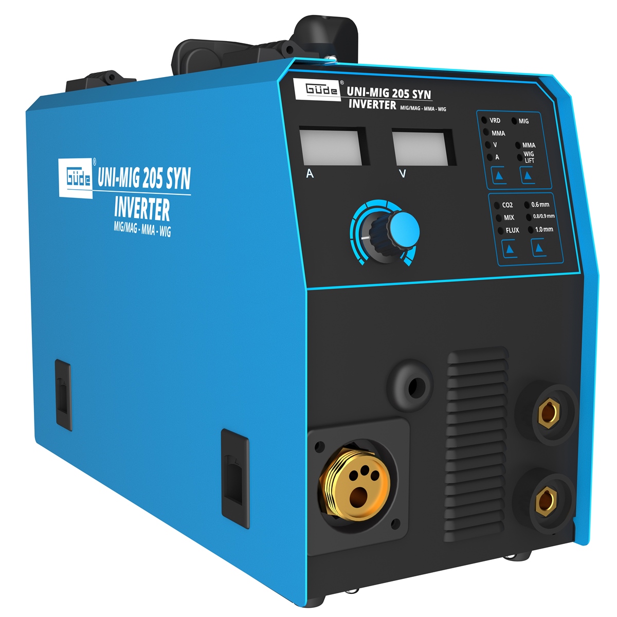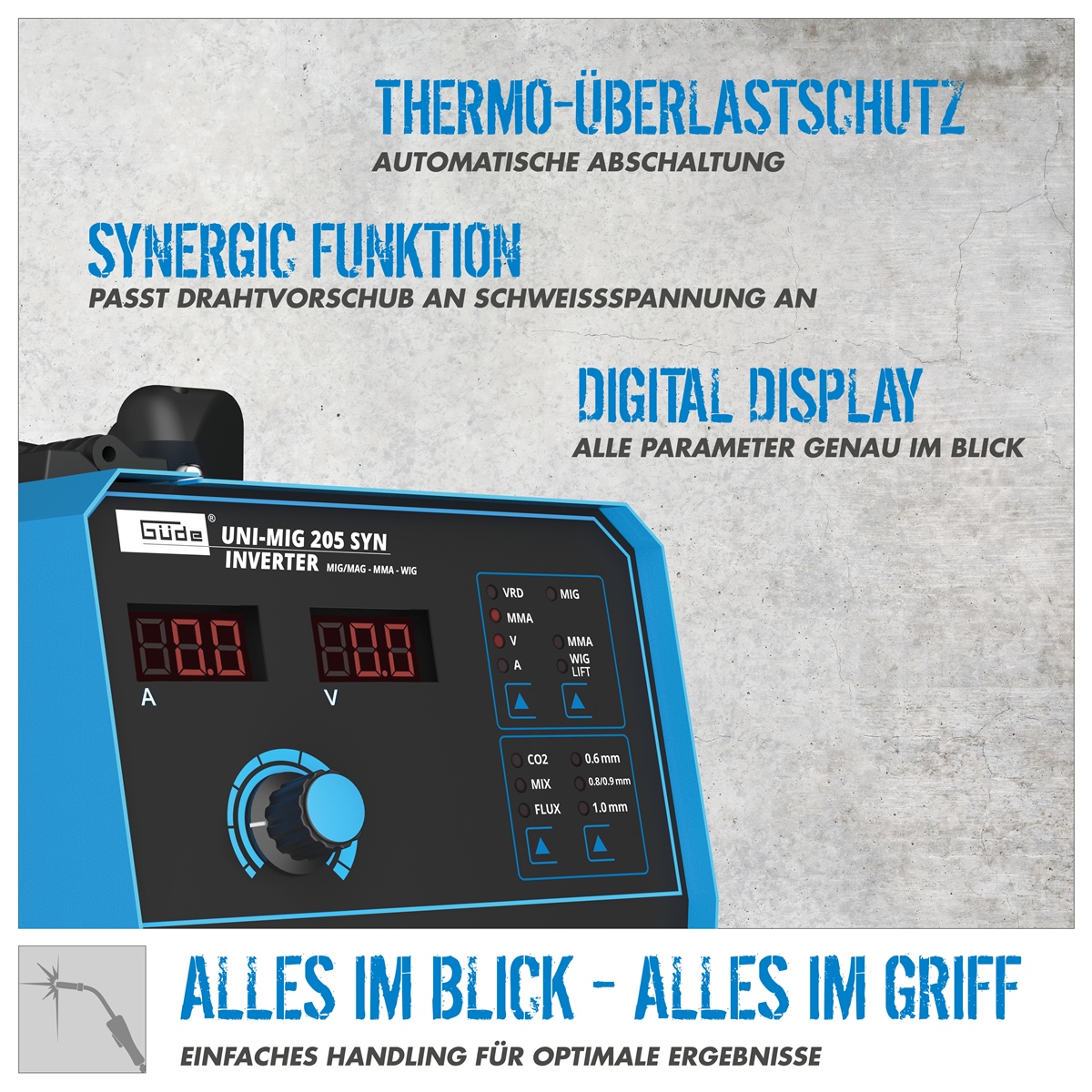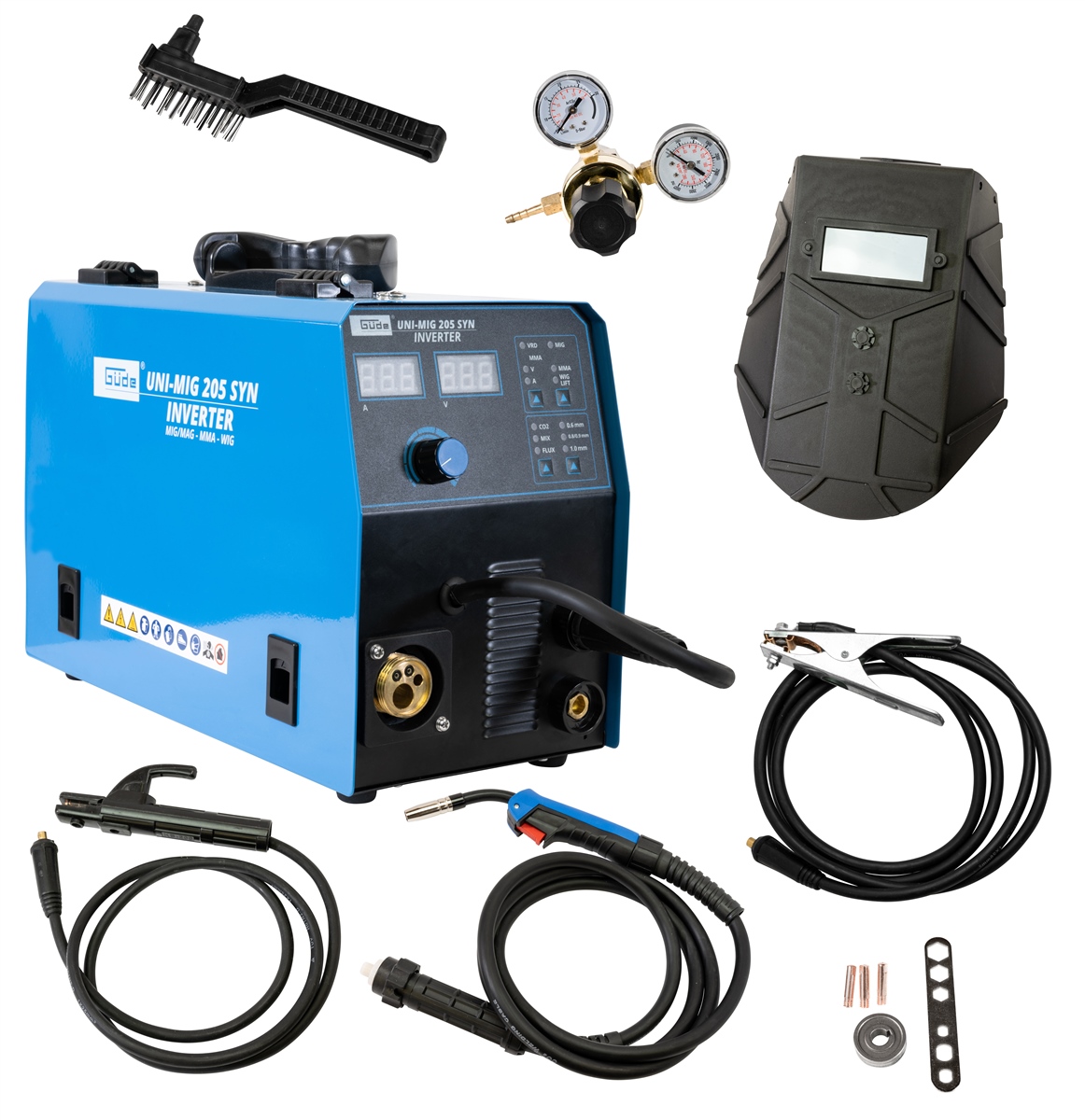 Das Uni-Mig 205 SYN gehört zu den Universalgeräten der Inverterschweissgeräte in der Güde-Produktlinie. Mit dem Uni-Mig 205 SYN sind praktisch alle 4 Schweißverfahren möglich, MIG-MAG, MMA (Elektrodenschweißen), Flux (Fülldrahtschweißen) und schließlich WIG-Schweißen (optional). Die bewährten Zusatzeigenschaften wie Anti-Stick, Hot Start und Arc Force, sorgen für höchsten Schweißkomfort, auch unter schwierigen Bedingungen. Der neue, innovative, synergic-geregelte Drahtvorschub stellt sich, nach Auswahl von Schweißverfahren, Drahtstärke und Schweißstärke, automatisch auf die passende Geschwindigkeit ein. Vor allem auch Einsteigern und noch ungeübten Schweißern ermöglichen diese Zusatzfunktionen, sofort gute Schweißergebnisse. Elektrodenhalter und Masseklemme, sowie das Schweißschild und der Bürstenhammer, für MMA-Prozesse sind selbstverständlich serienmäßig im Lieferumfang enthalten. Gleiches gilt natürlich für den MIG-MAG-Brenner und den Druckregler für das Schutzgas. Der ebenfalls im Lieferumfang enthaltene Schweißwagen sorgt für Ordnung und optimale Mobilität.