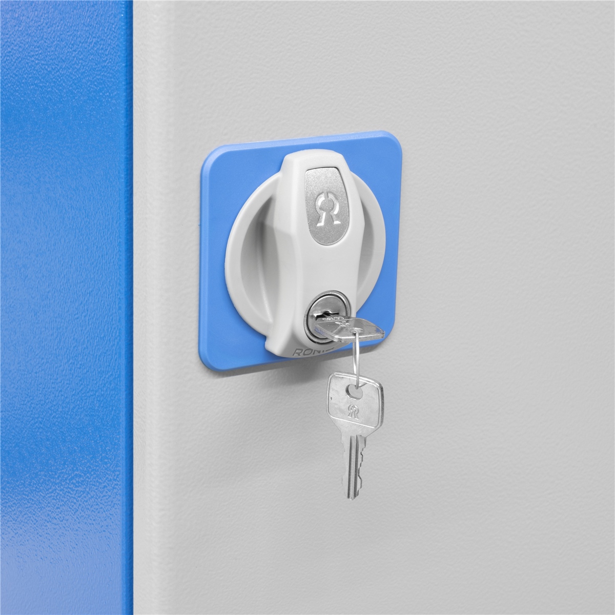 - pulverbeschichtet: RAL 5015 (Korpus) und RAL 7001 (Tür)