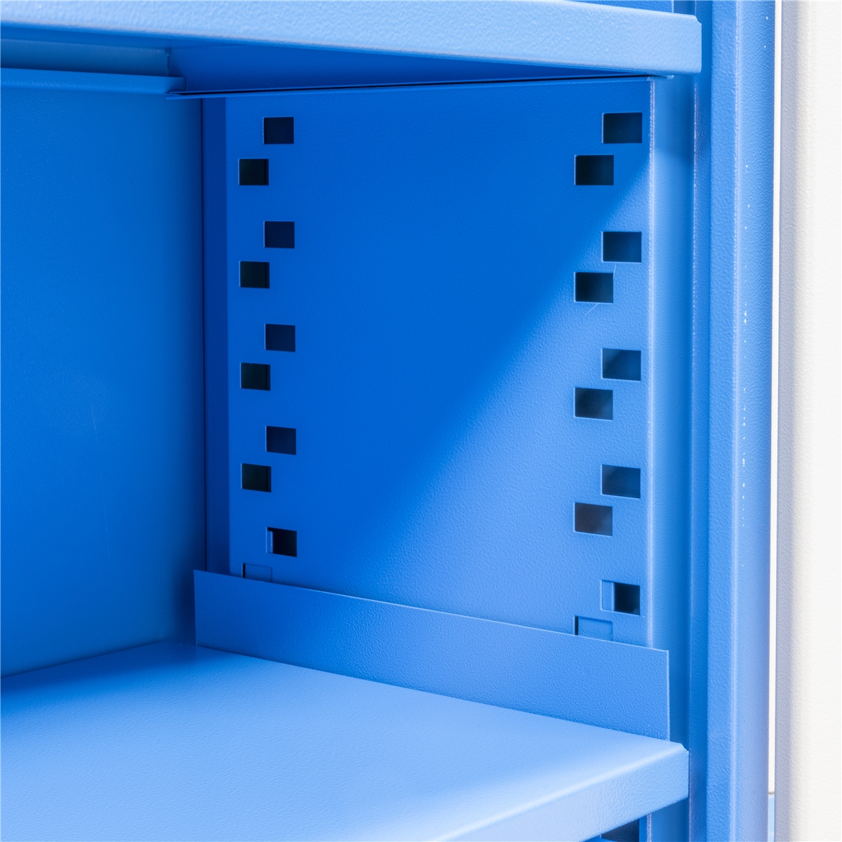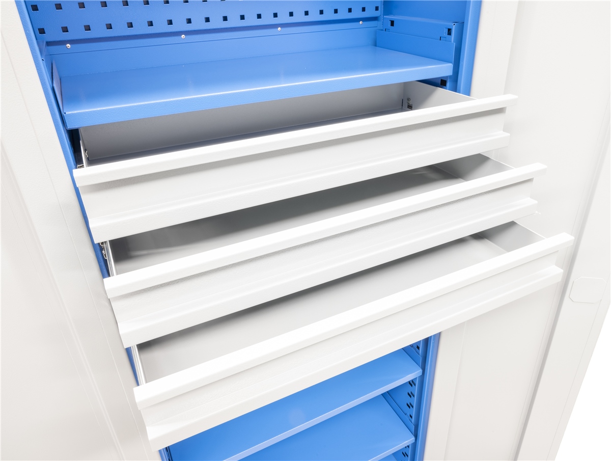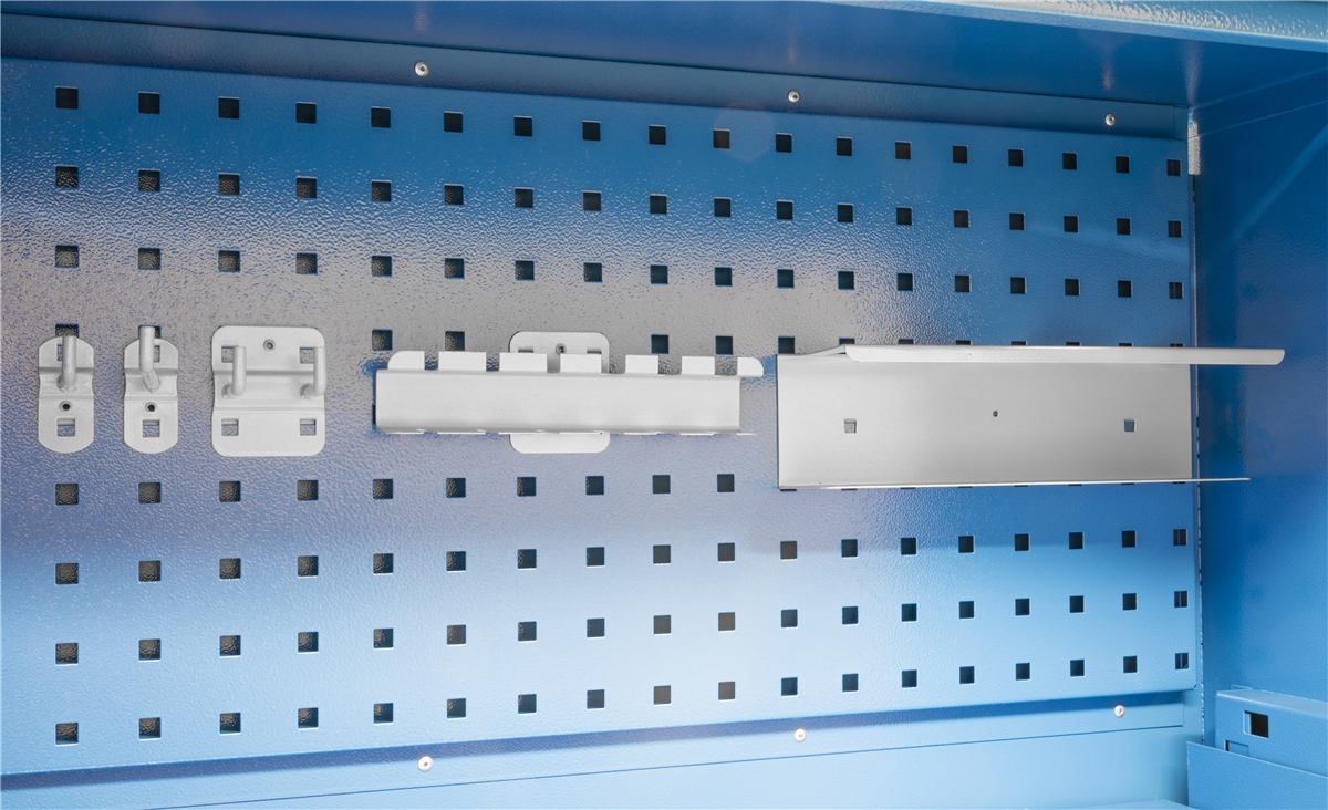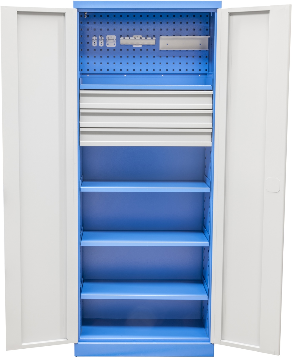Fertig montierter, abschließbarer Werkzeugschrank für die optimale Aufbewahrung von Werkzeugen und Kleinteilen. Vier, universell einhängbare Fachböden ermöglichen die Lagerung von größeren Werkzeugen oder Maschinen. 3 Kugelgelagerte Schubladen sorgen für Ordnung von Kleinteilen oder beispielsweise Messmittel. Inklusive intergrierter Lochwand und Haken-Set zur übersichtlichen Aufbewahrung von beispielsweise Schraubendrehern, Hämmer, Zangen sowie zwei Sprühdosenhalter. Stabile, pulverbeschichtete Ganzstahlkonstuktion mit innenliegenden Schranieren und verdecktem Schließgestänge. Ein hochwertiges Zylinderschloss inkl. zweier Schlüssel sorgt schließlich für sichere Aufbewahrung der Werkzeuge.