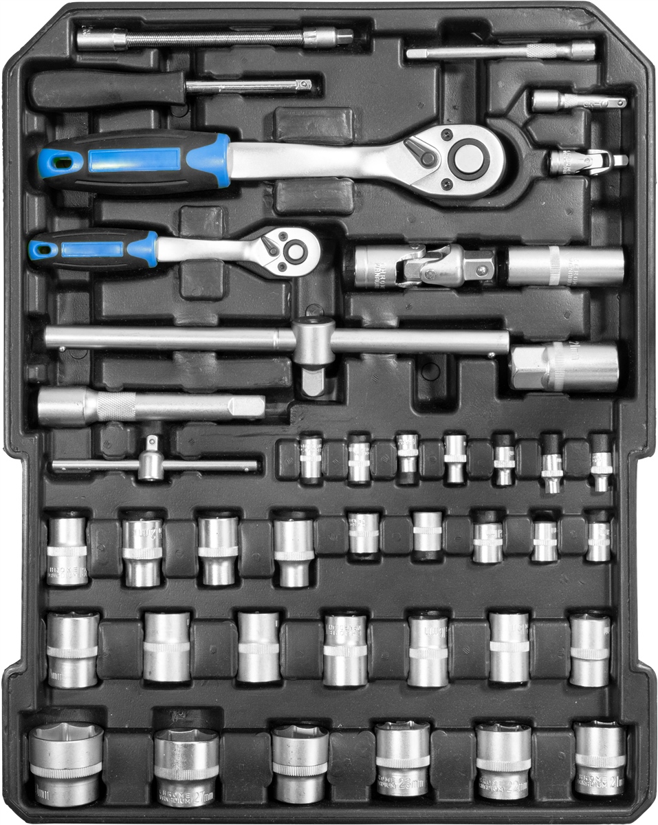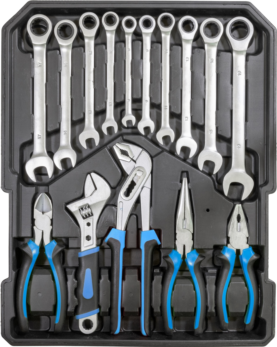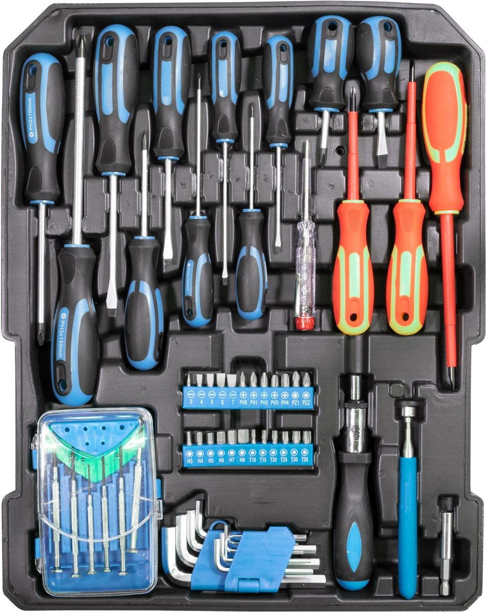 Praktischer mobiler Werkzeug-Trolley mit überzeugender Bestückung: 500 Teile vom großen Schraubendreher-Sortiment, über Ratschen und Steckschlüssel, diverse Zangen und Gabelringratschenschlüssel bis hin zum Bit-Schraubendreher mit Ratschenfunktion und passendem Bit-Sortiment. Wasserwaage, Maßband & Co fehlen natürlich auch nicht. Das Schraubendreher-Sortiment umfasst 9 klassische, 2 kurze Schraubendreher, 3 isolierte Schraubendreher, einen Elektriker-Schraubendreher und außerdem 6 Präzisionsschraubendreher. Für die zwei Ratschen (1/2“ und 1/4“) gibt es ein umfangreiches Sortiment an langen und kurzen Steckschlüsseleinsätzen, sowie T-Gleitgriffen und diversen Verlängerungen. Ebenso sind natürlich auch zwei Zündkerzeneinsätze in 16 und 21 mm Bestandteil dieses gut sortierten Werkzeug-Trolleys.