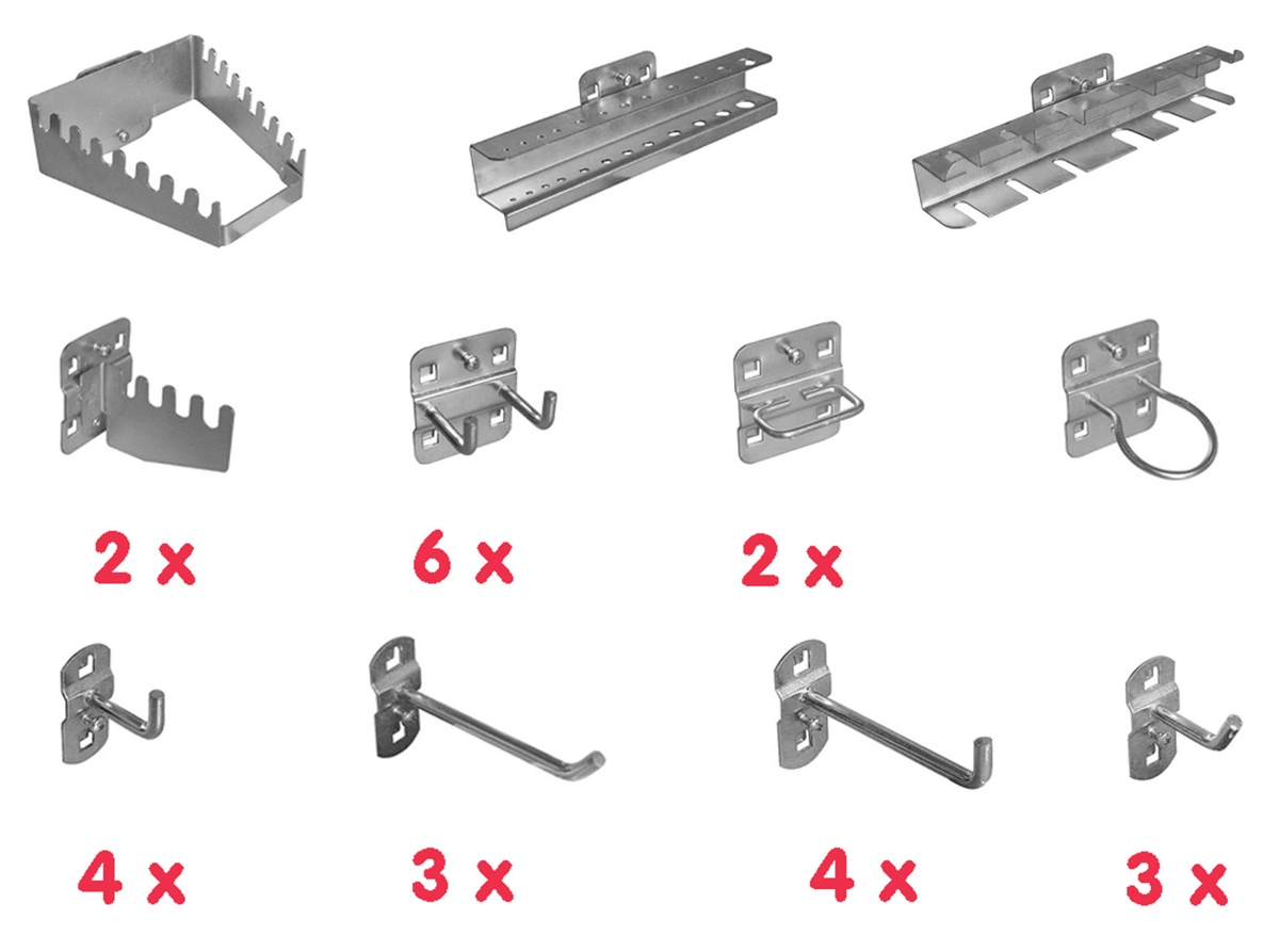 - Das gesamte Sortiment an Werkzeughaltern- und Haken ist passend für Güde-Lochplatten und Systeme mit einer quadratischen Lochung von 8x8 - 10x10 mm und einem Lochmitte-Abstand von 38 mm.