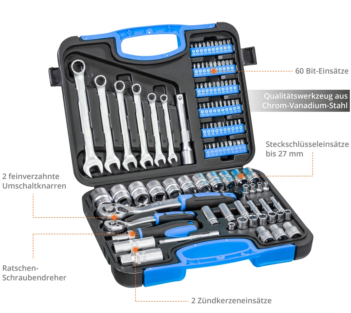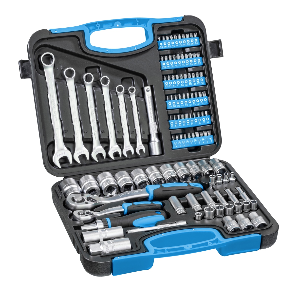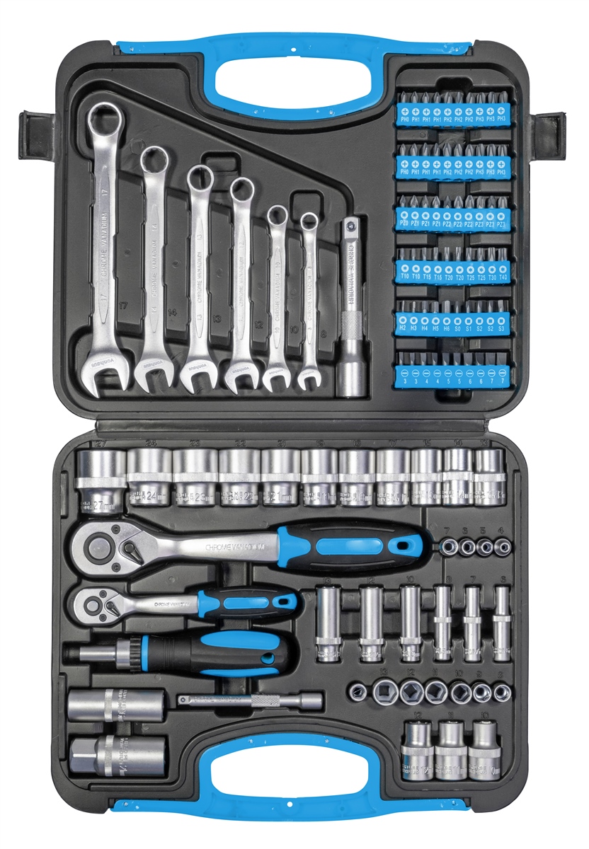 Dieses Werkzeug-Set im praktischen Koffer bestehend aus 104 Teilen. Es umfasst 2 Ratschen (1/2" und 1/4" mit 72 Zähnen) mit passenden Steckschlüsseleinsätzen in kurz und lang, sowie entsprechende Verlängerungen. Ein großes Bitsortiment, Bit-Schraubendreher mit Ratschenfunktion, sowie alle nötigen Adapter und 6 Gabelringschlüssel machen dieses Set komplett.