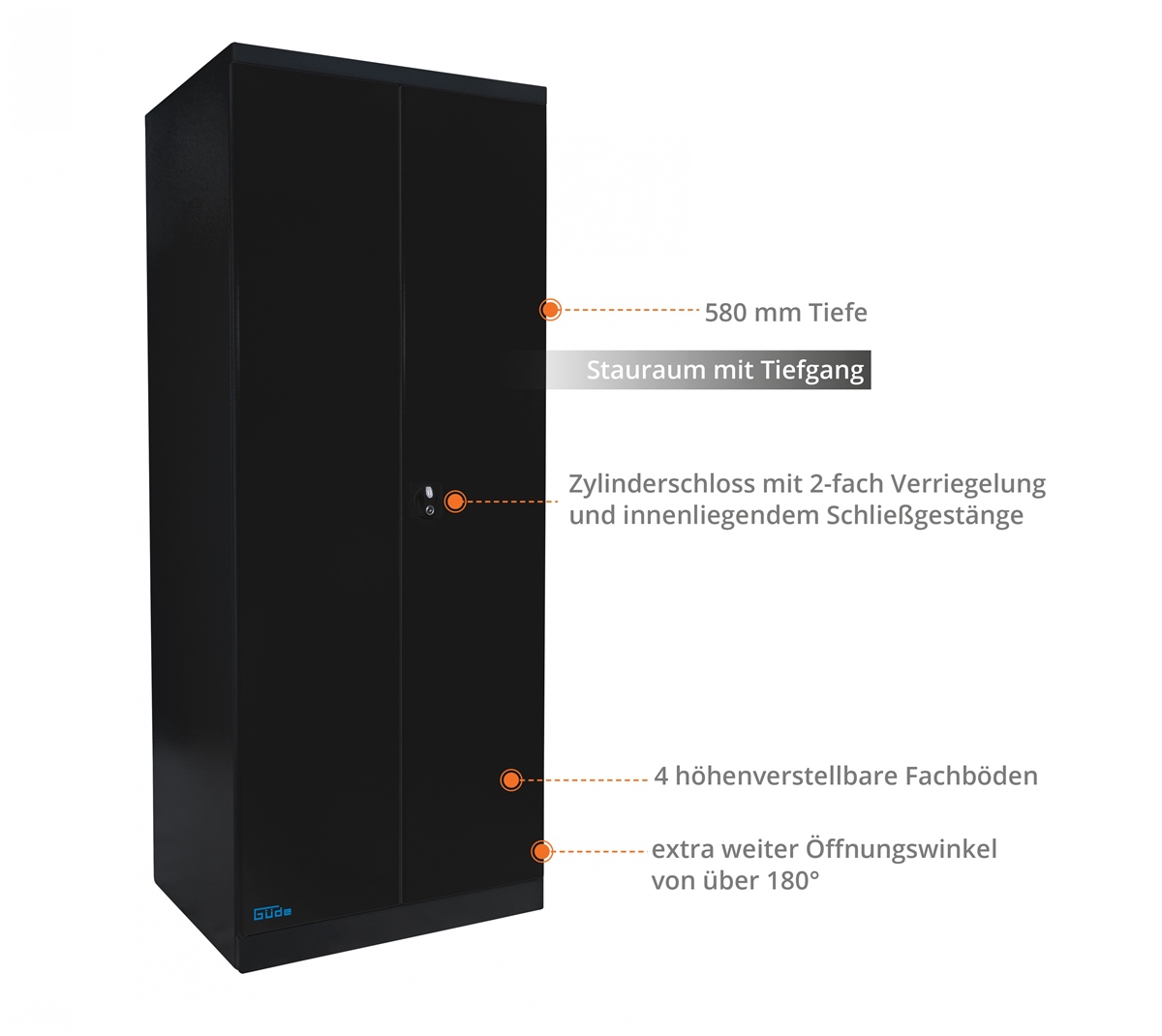 werkzeugschrank TYP BG Black Line, Profi-Qualität in zeitlosem Design - das ist unsere Neuauflage eines seit Jahrzehnten bewährten Klassikers. Eine verschweißte Ganzstahlkonstruktion, pulverbeschichtet und im Rundkanten-Design - schlicht und dennoch stilvoll. Durch 4 höhenverstellbare Fachböden mit einer maximalen Traglast von je 50 kg ist dieser Schrank auch für schwerere Gerätschaften und Werkzeuge prädestiniert. Der extra weite Öffnungswinkel der beiden Flügeltüren von über 180° ermöglicht einen sehr komfortablen Zugang zu großzugigem Stauraum für Arbeitsmaterialien und Werkzeugen aller Art.