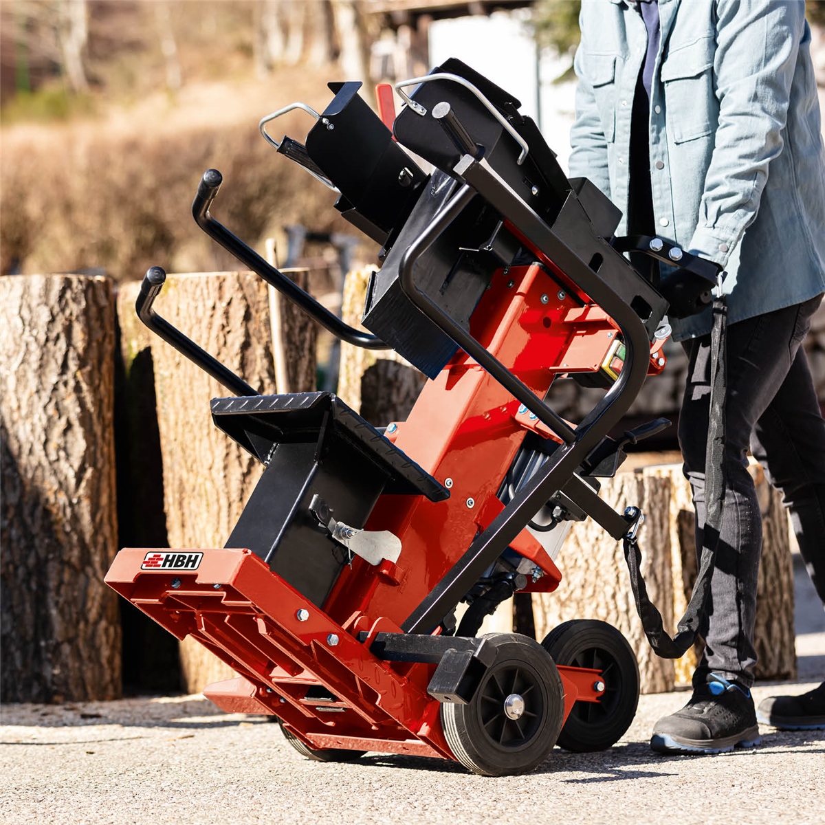 Mit 15 Tonnen spaltet der 190 x 85 mm Spaltkeil des HBH HSSD1500C Spaltgut mit bis zu 1070 mm Länge und einem Durchmesser von maximal 450 mm. Der Holzspalter verarbeitet mühelos Hart- und Weichholz. Mit dem schwenkbaren Tisch stehen zwei Arbeitshöhen zur Verfügung. Stämme mit Maximallänge können auf Bodenniveau verarbeitet werden, kleinere Stämme werden auf den erhöhten Tisch gestellt. Fangbügel und Zwei-Hand-Bedienung sorgen für optimale Sicherheitsbedingungen.