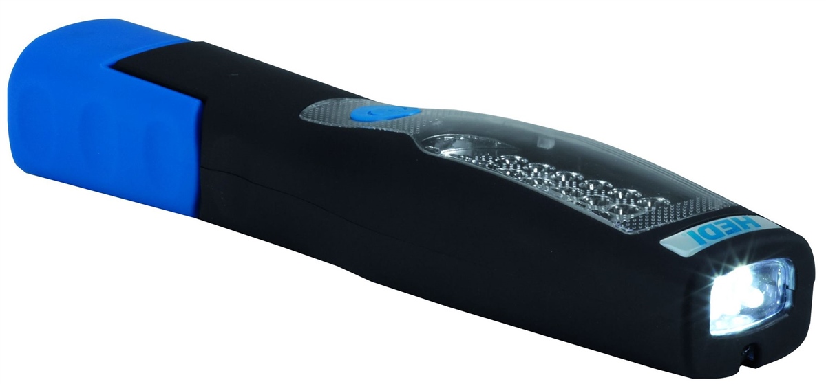 HEDI Akku LED-Handleuchte "Komfort". Optimal geeignet für Handwerker, Heimwerker, Inspekteure usw.. Mit 21 hellen LED für eine gezielte Ausleuchtung an der Seite und 5 weiteren LED oben für eine alternative Taschenlampenfunktion. Aus robustem, gummierten Gehäuse. Mit zwei drehbarem Aufhängehaken und zwei Haltemagneten auf der Rückseite. Zusätzlich hat die Leuchte einen weiteren Haltemagneten am abknickbaren Fuß. Mit Lithium-Akku für eine Leuchtdauer von ca. 4 Std.. Ein KFZ- und ein 250 V- Ladekabel sind Teil des Lieferumfangs. Abmessungen: 255 x 50 x 45 mm. Schutzart IP 20.Technische Daten: