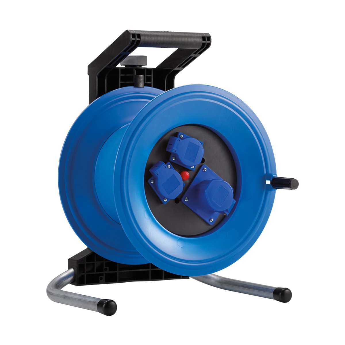 Kunststoff-Kabeltrommel Professional Plus 320, leer, für bis zu 60 m Neopren-Gummi-Leitung, 1 CEE-Steckdose 3x16 A und 2 Schuko-Steckdosen, Thermoschutzschalter.Technische Daten: