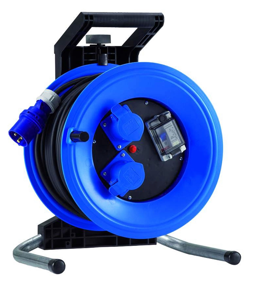 Kunststoff-Kabeltrommel Professional Plus 320, 25 m Neopren-Gummi-Leitung H07RN-F 3G2,5, 2 CEE-Steckdose 3x16 A, Personenschutzschalter (RCD) 25/0,03 A und Thermoschutzschalter. Für den ständigen Einsatz im Freien.Technische Daten: