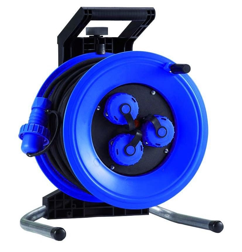 Kunststoff-Kabeltrommel Professional Plus 320, 25 m Neopren-Gummi-Leitung H07RN-F 3G1,5 mit druckwasserdichtem Stecker, 3 druckwasserdichte Schuko-Steckdosen, Schutzart IP 67, und Thermoschutzschalter. Für den ständigen Einsatz im Freien.Technische Daten: