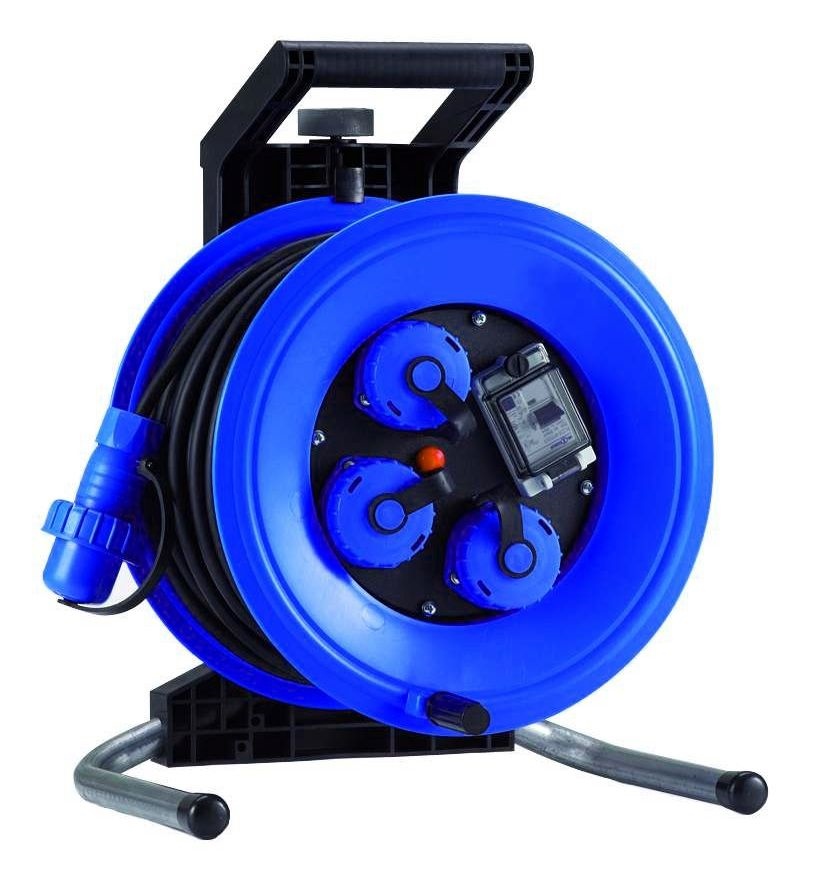 Kunststoff-Kabeltrommel Professional Plus 320, 25 m Neopren-Gummi-Leitung H07RN-F 3G1,5 mit druckwasserdichtem Stecker, 3 druckwasserdichte Schuko-Steckdosen, Schutzart IP 67, Personenschutzschalter (RCD) 25/0,03 A und Thermoschutzschalter. Für den ständigen Einsatz im Freien.Technische Daten: