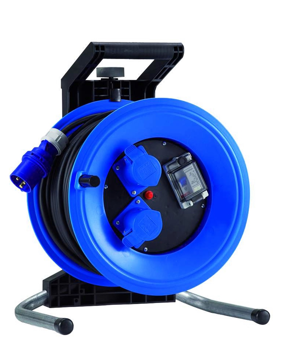 Kunststoff-Kabeltrommel Professional Plus 320, 40 m Neopren-Gummi-Leitung H07RN-F 3G2,5, 2 CEE-Steckdose 3x16 A, Personenschutzschalter (RCD) 25/0,03 A und Thermoschutzschalter. Für den ständigen Einsatz im Freien.Technische Daten: