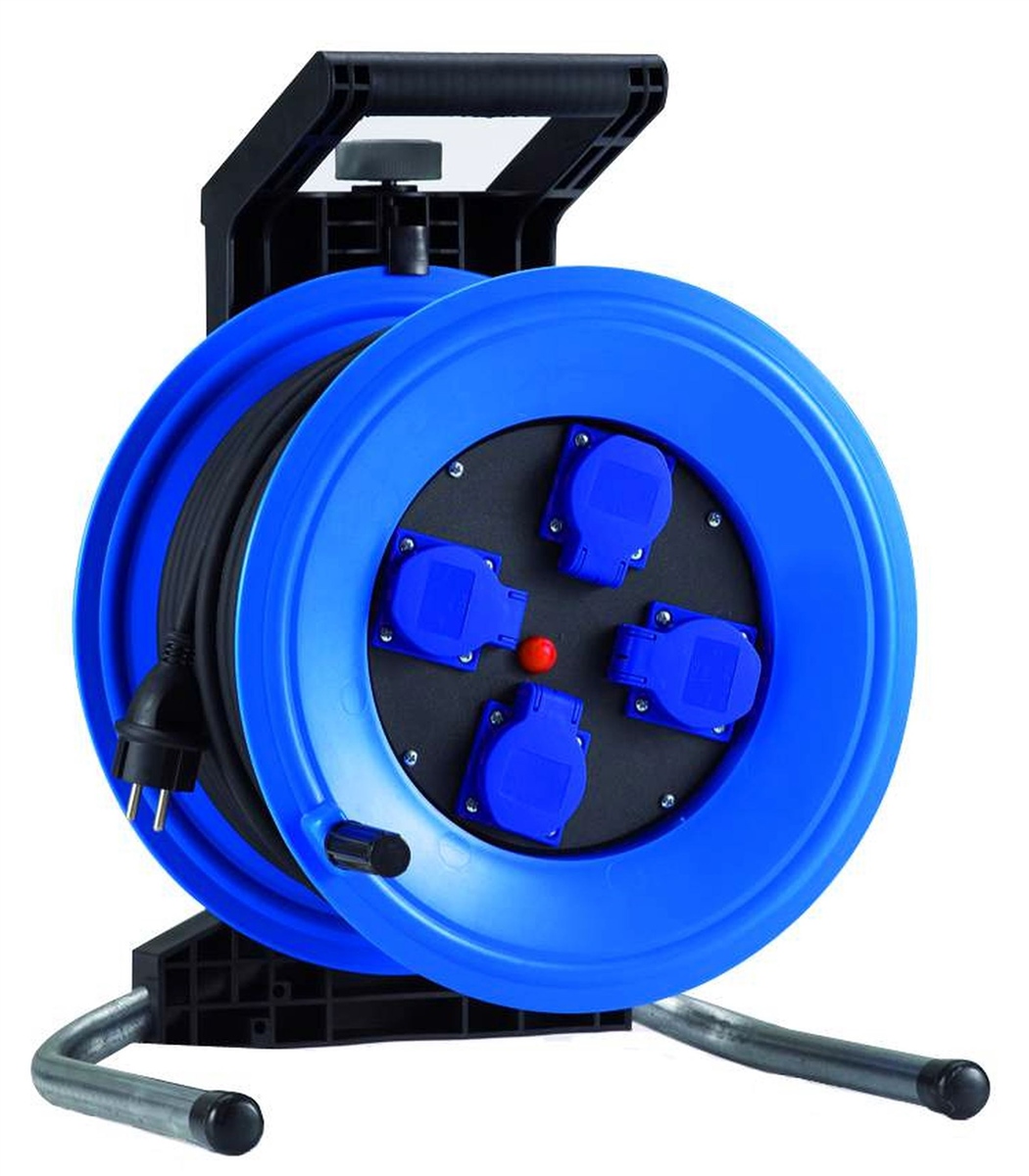 Kunststoff-Kabeltrommel Professional Plus 320, 40 m Neopren-Gummi-Leitung H07RN-F 3G2,5, 4 einzelne Schuko-Steckdosen, Thermoschutzschalter. Für den ständigen Einsatz im Freien.Technische Daten: