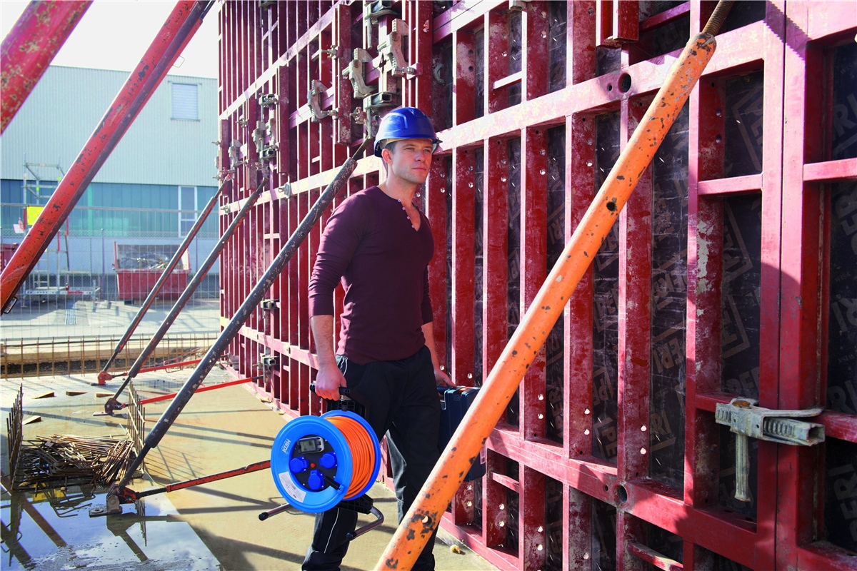 Kunststoff-Kabeltrommel Professional Plus 320, 50 m HEDI Panzerkabel Plus H07BQ-F 3G1,5, 3 einzelne Schuko-Steckdosen, Personenschutzschalter (RCD) 25/0,03 A und Thermoschutzschalter. Für den ständigen Einsatz im Freien.Technische Daten: