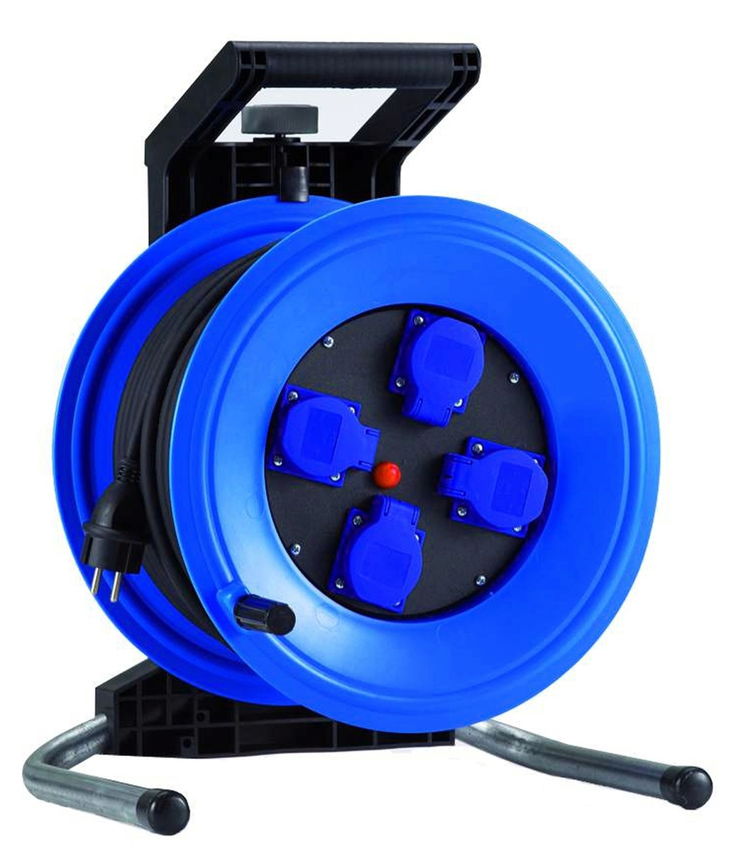 Kunststoff-Kabeltrommel Professional Plus 320, 60 m Neopren-Gummi-Leitung H07RN-F 3G1,5, 4 einzelne Schuko-Steckdosen, Thermoschutzschalter. Für den ständigen Einsatz im Freien.Technische Daten: