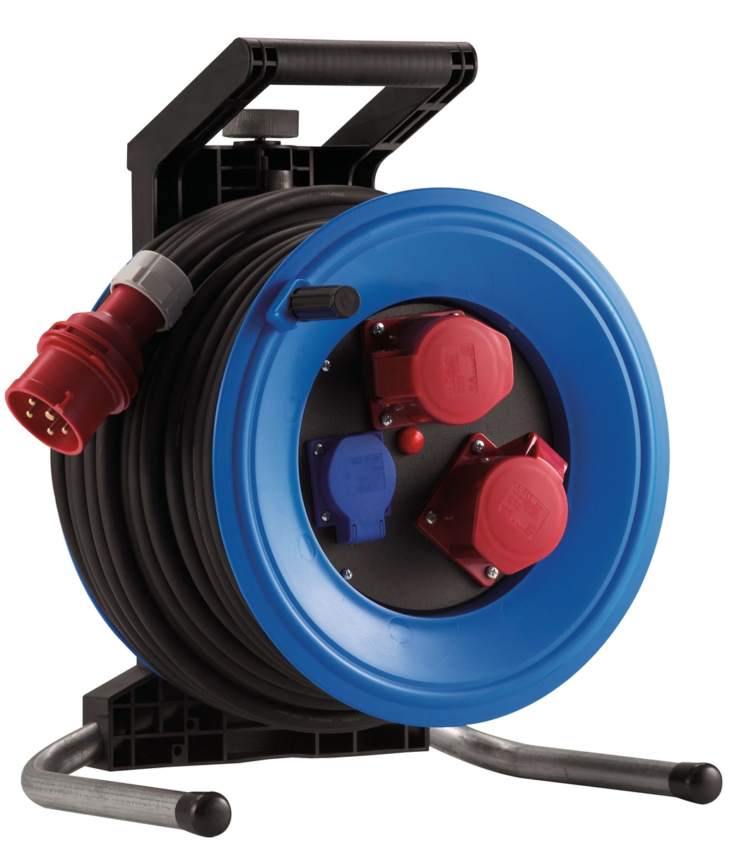 Kunststoff-Kabeltrommel Professional Plus 320, Drehstromausführung, 25 m H07RN-F 5G2,5, 2 CEE-Steckdosen 5x16 A und 1 Schuko-Steckdose, Thermoschutzschalter. Für den ständigen Einsatz im Freien.Technische Daten: