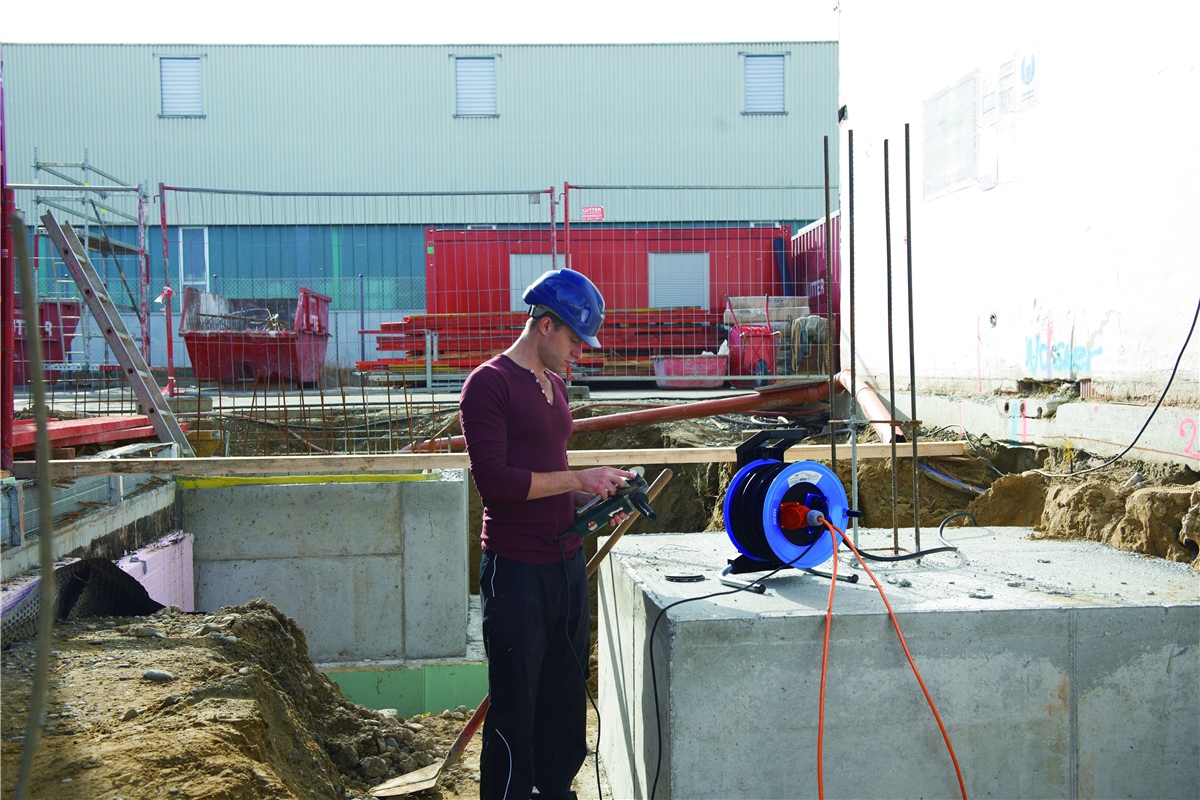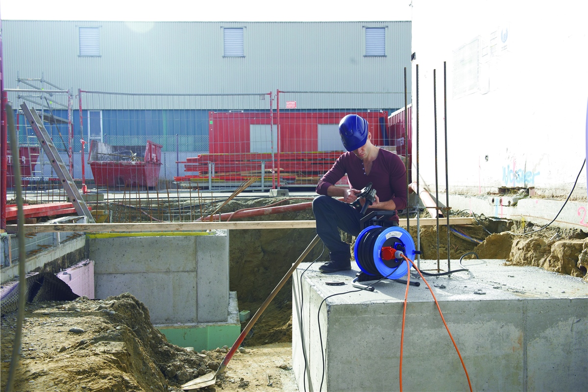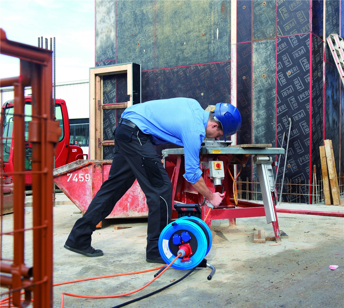 Kunststoff-Kabeltrommel Professional Plus 320, Drehstromausführung, 33 m H07RN-F 5G2,5, 1 CEE-Steckdose 5x16 A und 2 Schuko-Steckdosen, Thermoschutzschalter. Für den ständigen Einsatz im Freien.Technische Daten: