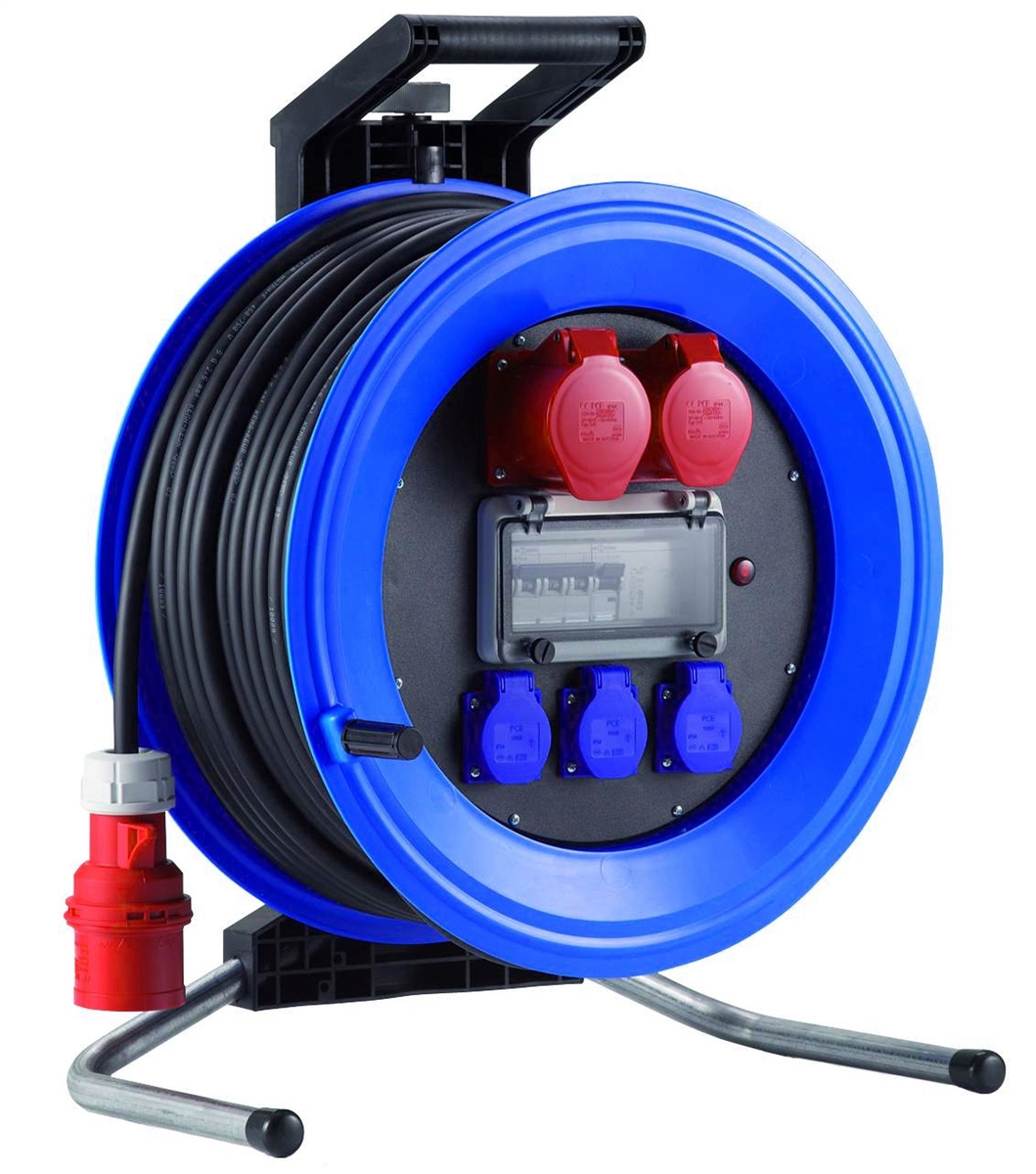 Kunststoff-Kabeltrommel Professional Plus 450, Drehstromausführung 16 A, leer, für bis zu 50 m Neopren-Gummi-Leitung, 2 CEE-Steckdosen 5x16 A und 3 Schuko-Steckdosen, Personenschutzschalter (RCD) 25/0,03 A und Thermoschutzschalter.Technische Daten: