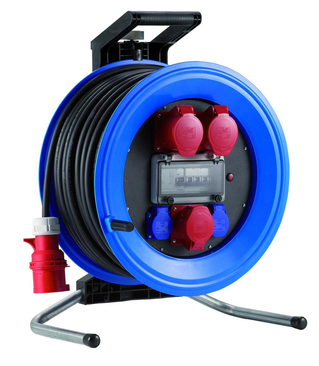 Kunststoff-Kabeltrommel Professional Plus 450, Drehstromausführung 32 A, 25 m H07RN-F 5G4,0, 2 CEE-Steckdosen 5x32 A, 1 CEE-Steckdose 5x16 A und 2 Schuko-Steckdosen, Personenschutzschalter (RCD) 25/0,03 A und Thermoschutzschalter. Für den ständigen Einsatz im FreienTechnische Daten: