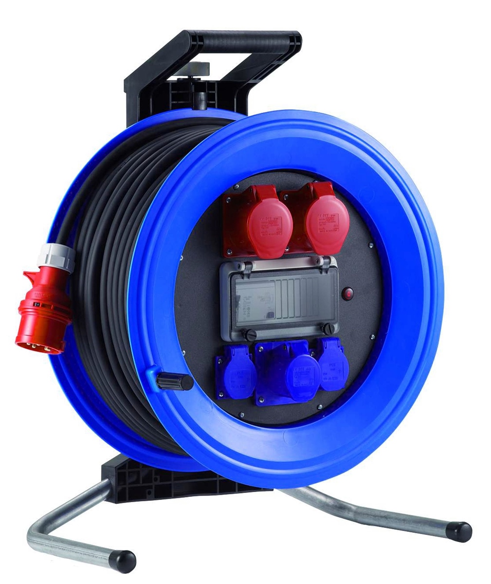 Kunststoff-Kabeltrommel Professional Plus 450, Drehstromausführung 32 A, 25 m H07RN-F 5G4,0, 1 CEE-Steckdose 5x32 A, 1 CEE-Steckdose 5x16 A, 1 CEE-Steckdose 3x16 A und 2 Schuko-Steckdosen, Personenschutzschalter (RCD) 25/0,03 A und Thermoschutzschalter. Für den ständigen Einsatz im FreienTechnische Daten: