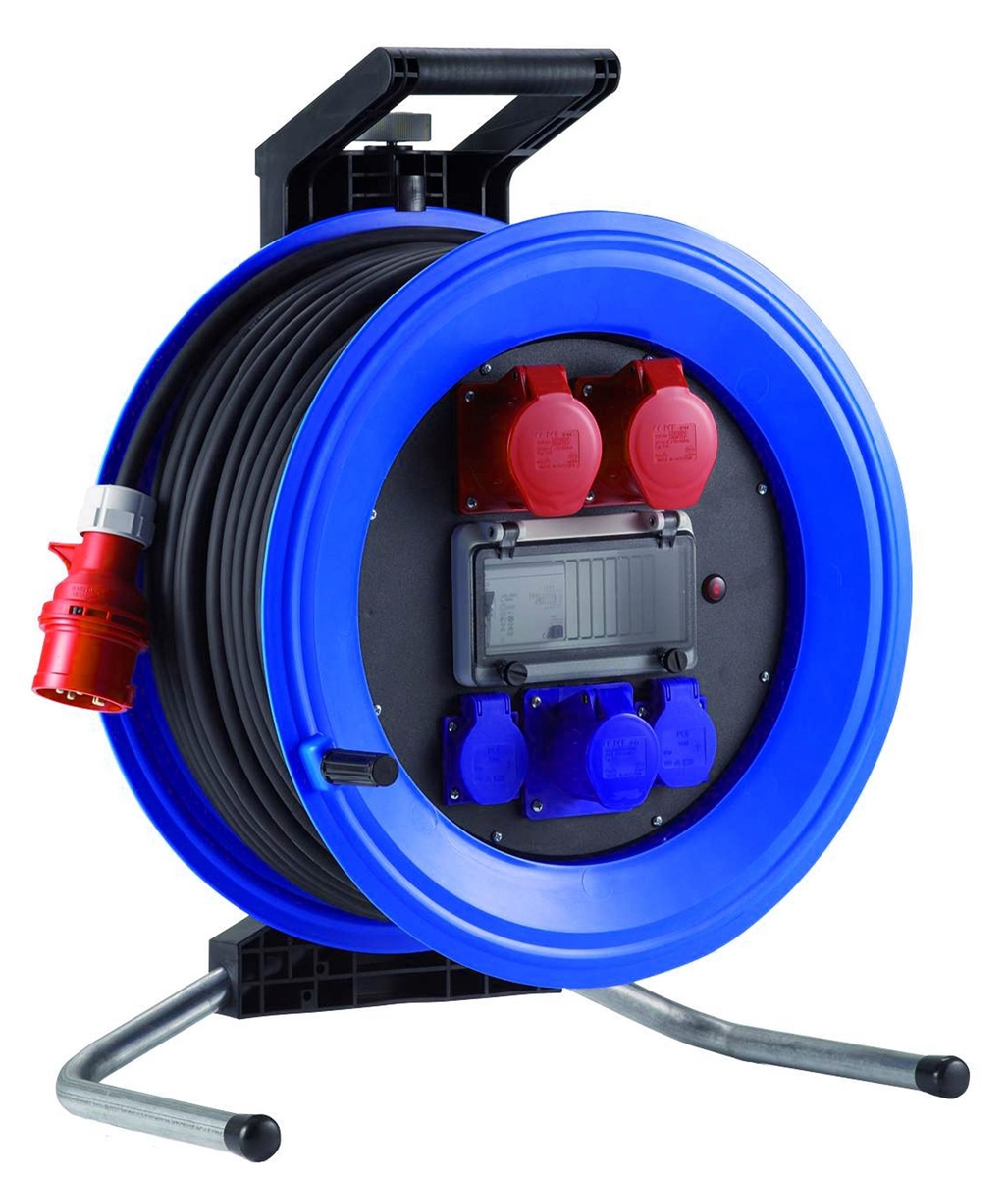 Kunststoff-Kabeltrommel Professional Plus 450, Drehstromausführung 32 A, 33 m H07RN-F 5G4,0, 1 CEE-Steckdose 5x32 A, 1 CEE-Steckdose 5x16 A, 1 CEE-Steckdose 3x16 A und 2 Schuko-Steckdosen, Personenschutzschalter (RCD) 25/0,03 A und Thermoschutzschalter. Für den ständigen Einsatz im FreienTechnische Daten: