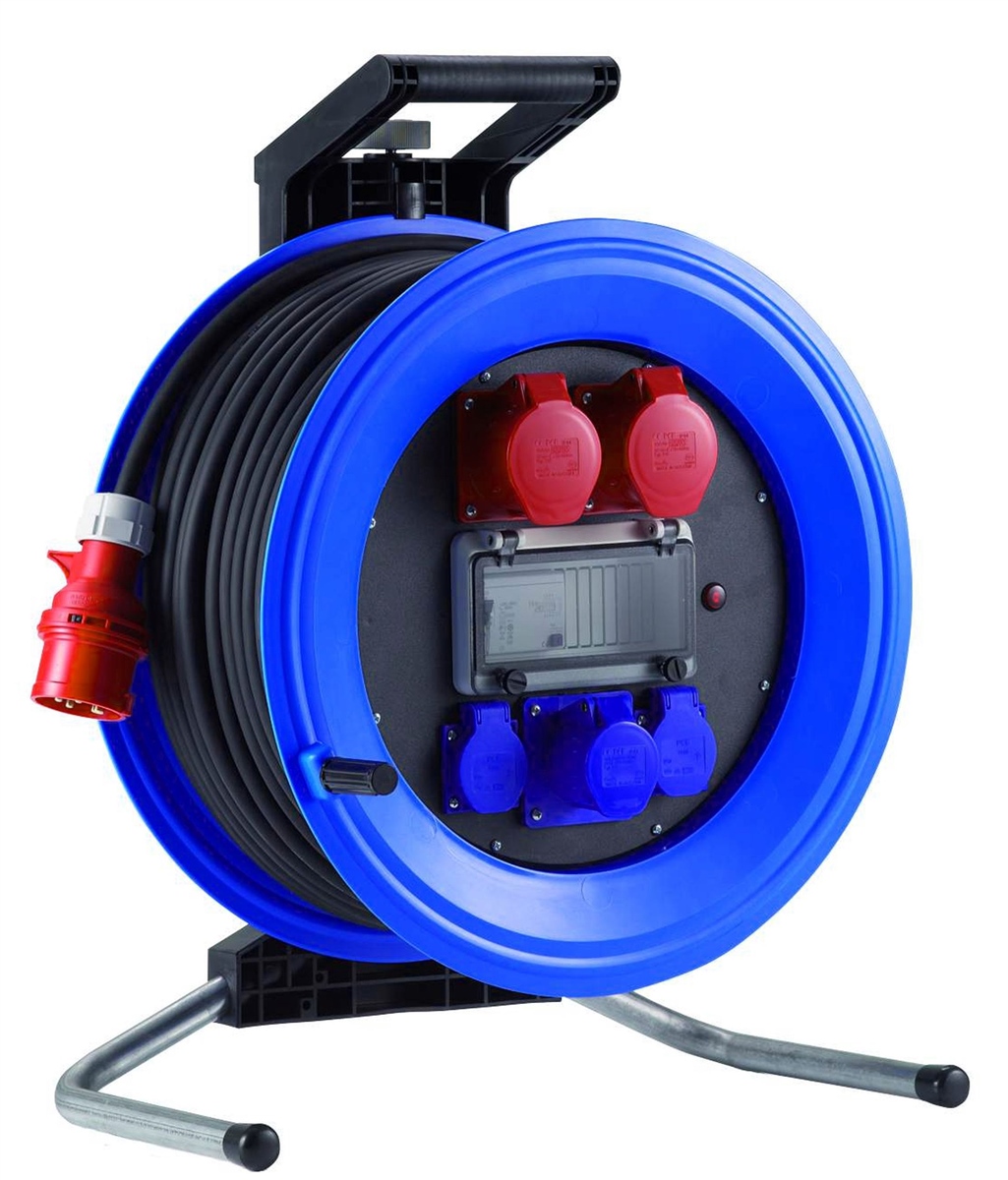 Kunststoff-Kabeltrommel Professional Plus 450, Drehstromausführung 16 A, 50 m H07RN-F 5G2,5, 2 CEE-Steckdosen 5x16 A, 1 CEE-Steckdose 3x16 A und 2 Schuko-Steckdosen, Personenschutzschalter (RCD) 25/0,03 A und Thermoschutzschalter. Für den ständigen Einsatz im FreienTechnische Daten: