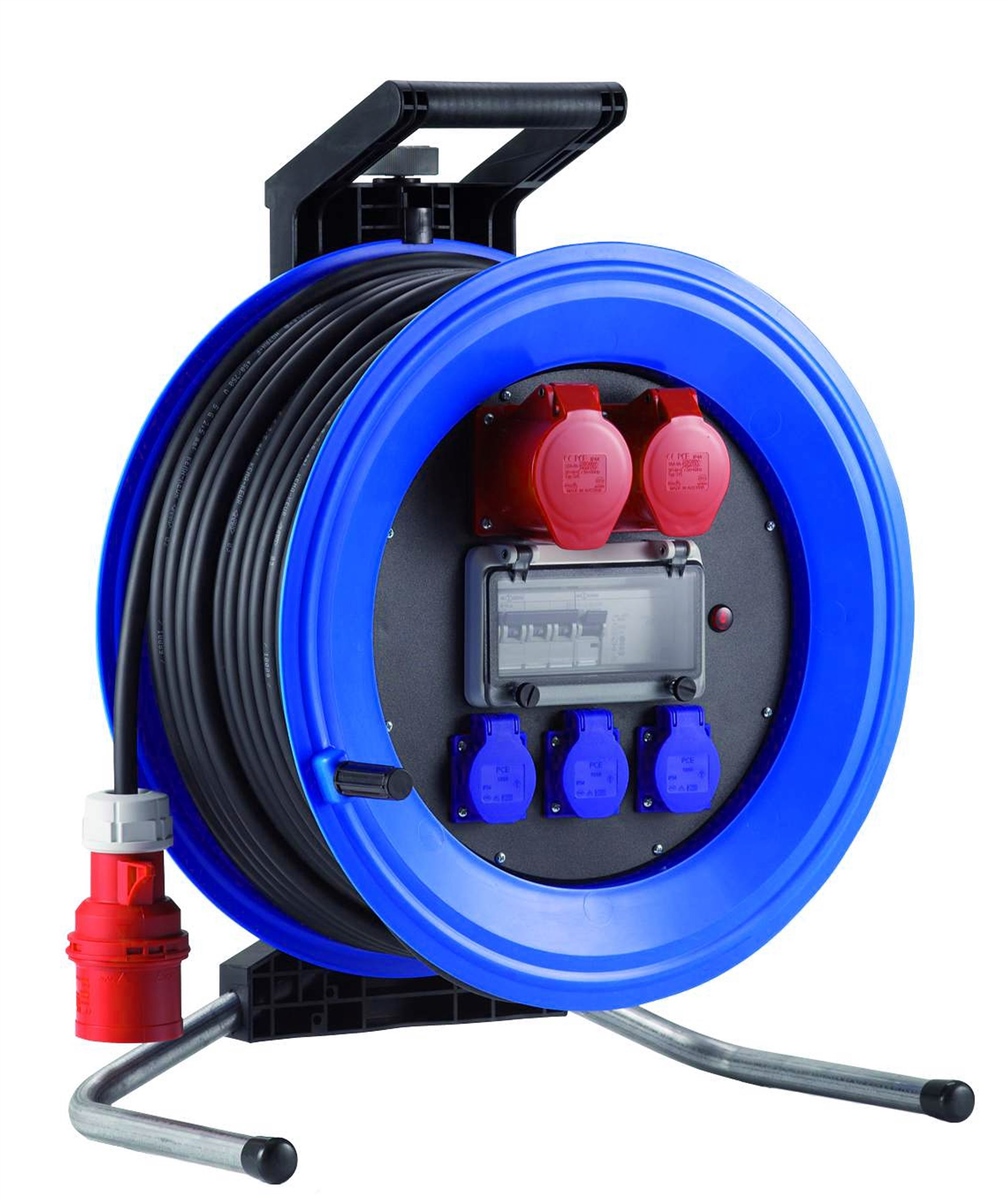 Kunststoff-Kabeltrommel Professional Plus 450, Drehstromausführung 16 A, 50 m H07RN-F 5G2,5, 2 CEE-Steckdosen 5x16 A und 3 Schuko-Steckdosen, Personenschutzschalter (RCD) 25/0,03 A und Thermoschutzschalter. Für den ständigen Einsatz im FreienTechnische Daten: