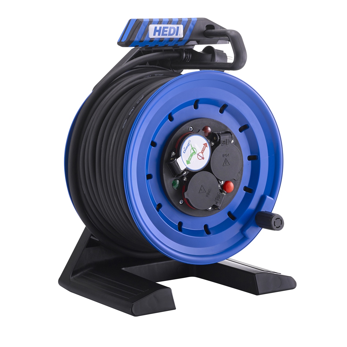 - Steckdoseneinsatz - Spritzwassergeschützter Steckdoseneinsatz mit drei Schuko-Steckdosen und bewährtem Diagnosesystem HEDI DiagS: Einsatzbereitschaft der Kabeltrommel auf einen Blick
