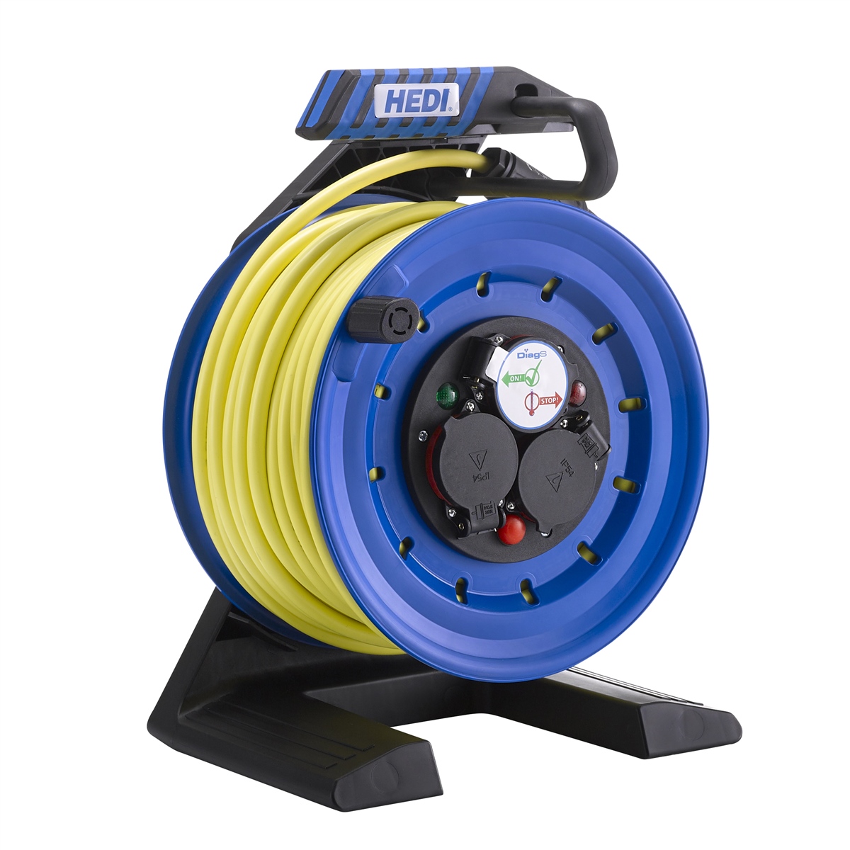 - Steckdoseneinsatz - Spritzwassergeschützter Steckdoseneinsatz mit drei Schuko-Steckdosen und bewährtem Diagnosesystem HEDI DiagS: Einsatzbereitschaft der Kabeltrommel auf einen Blick