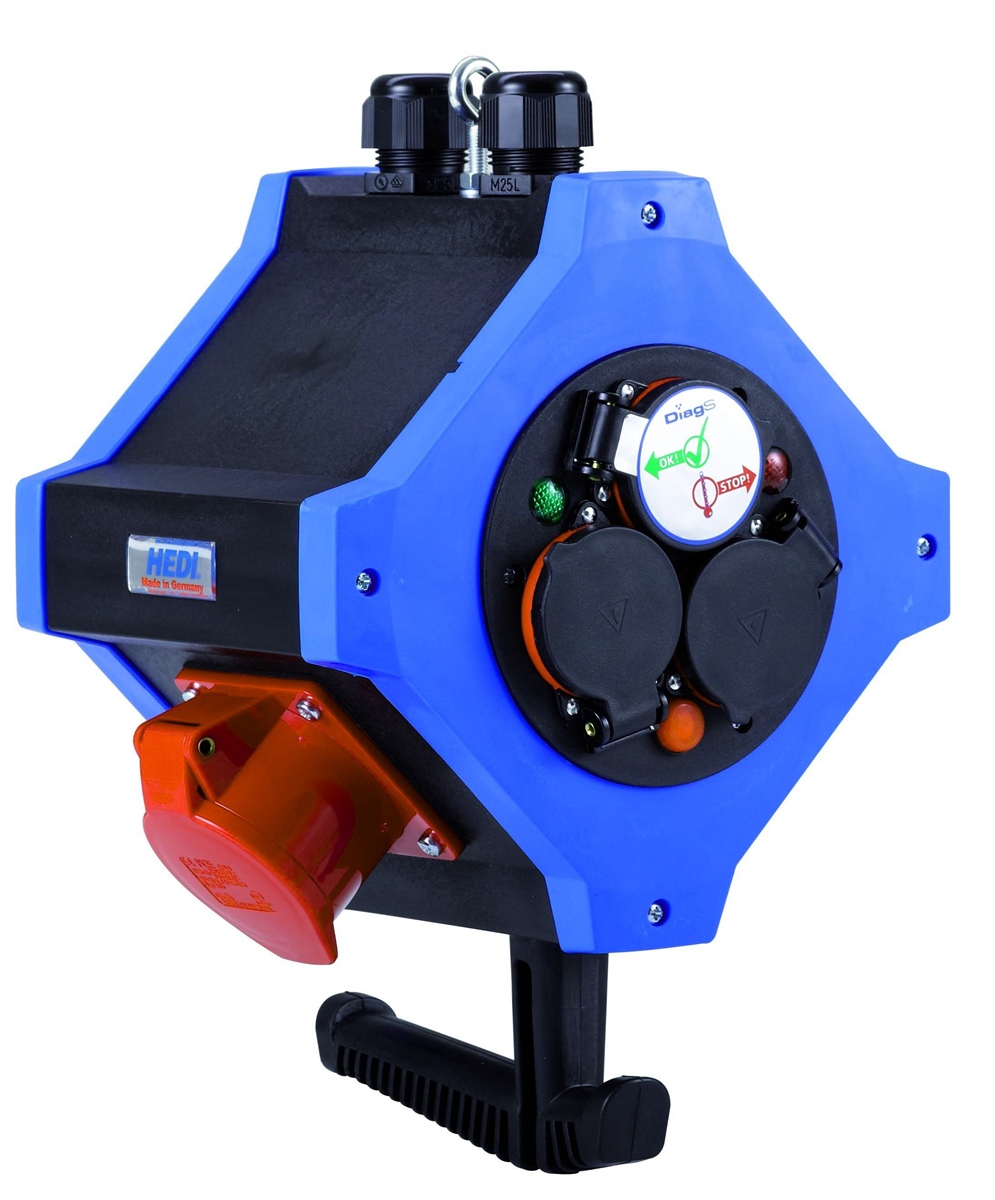 Energie-Hängeverteiler HEDI e.STATION in der Wechselstromausführung, Gehäuse mit Werkzeughaken aus glasfaserverstärktem Kunststoff und Gummi-Material an den Seiten, mit 2 m verzinkter Knotenkette und Karabiner zur Aufhängung, Ausgänge: 2 CEE-Steckdosen 5x16 A und 3 Schuko-Steckdosen, Personenschutzschalter 40 / 0,03 A. Spritzwassergeschützte Ausführung.Technische Daten: