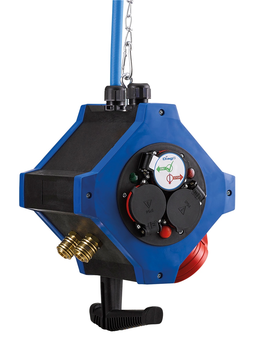 Energie-Hängeverteiler HEDI e.STATION in der Kombiausführung Energie - Druckluft, Gehäuse mit Werkzeughaken aus glasfaserverstärktem Kunststoff und Gummi-Material an den Seiten, mit 2 m verzinkter Knotenkette und Karabiner zur Aufhängung, 2 m Druckluftschlauch 9x 2,5 mm, Ausgänge: 1 CEE-Steckdose 5x16 A, 6 Schuko-Steckdosen, 2 Druckluft-Anschlusskupplungen 3/8". Spritzwassergeschützte Ausführung.Technische Daten: