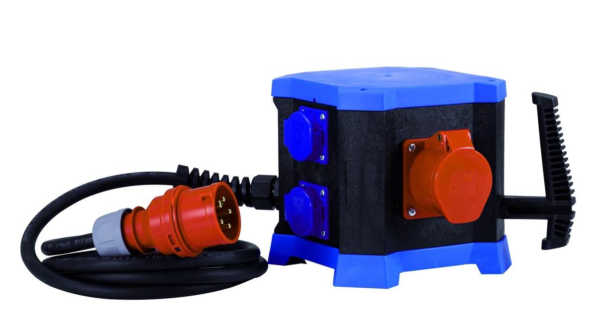 Steckdosenverteiler aus glasfaserverstärktem Kunststoff, Ober- und Unterseite mit vier Standfüßen aus Gummimaterial, mit großzügigem Tragegriff für den mobilen Einsatz, mit ca. 2,5 m Neopren-Gummi-Leitung H07RN-F 5G2,5 und CEE-Stecker 400 / 5x16 A; Ausgänge: 2 CEE-Steckdosen 5x 16 A und 4 Schuko-Steckdosen. Für den ständigen Einsatz im Freien.Technische Daten: