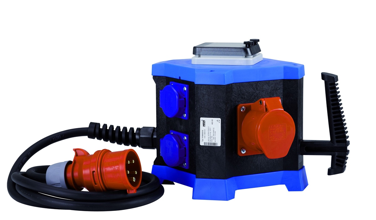Steckdosenverteiler aus glasfaserverstärktem Kunststoff, Ober- und Unterseite mit vier Standfüßen aus Gummimaterial, mit großzügigem Tragegriff für den mobilen Einsatz, mit ca. 2,5 m Neopren-Gummi-Leitung H07RN-F 5G2,5 und CEE-Stecker 400 V / 16 A; Ausgänge: 2 CEE-Steckdosen 5x 16 A und 4 Schuko-Steckdosen, elektronischer geeichter Stromzähler. Für den ständigen Einsatz im Freien.Technische Daten: